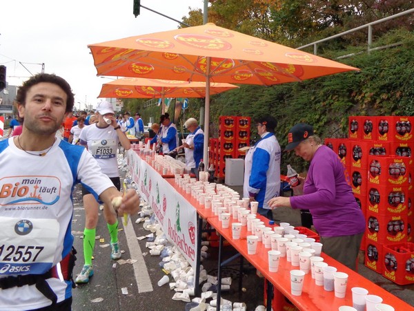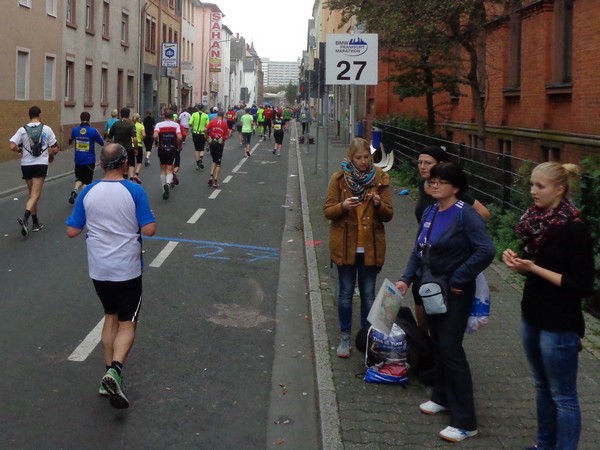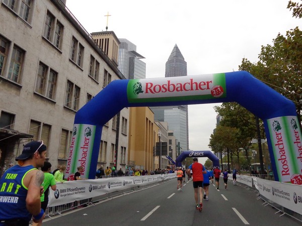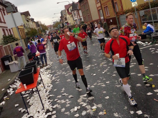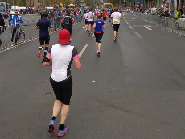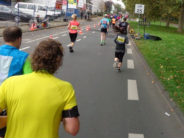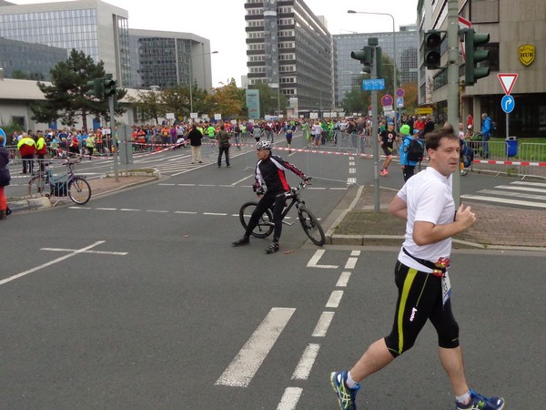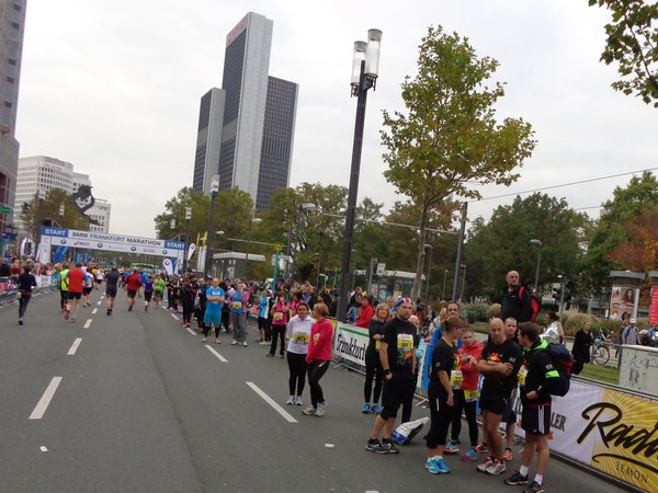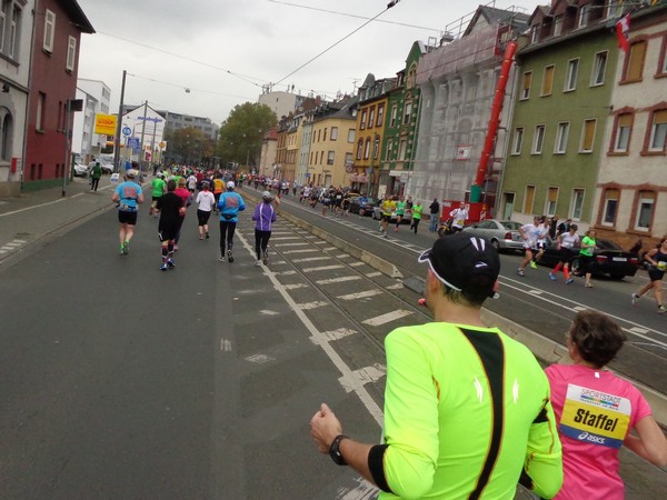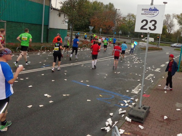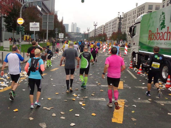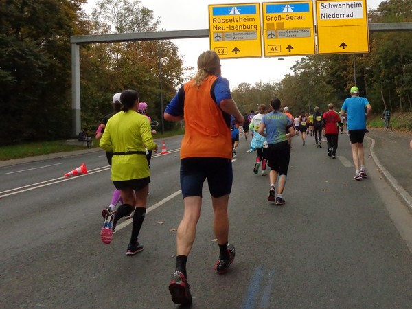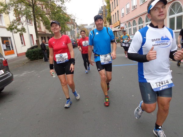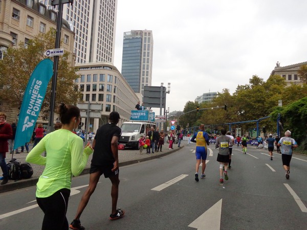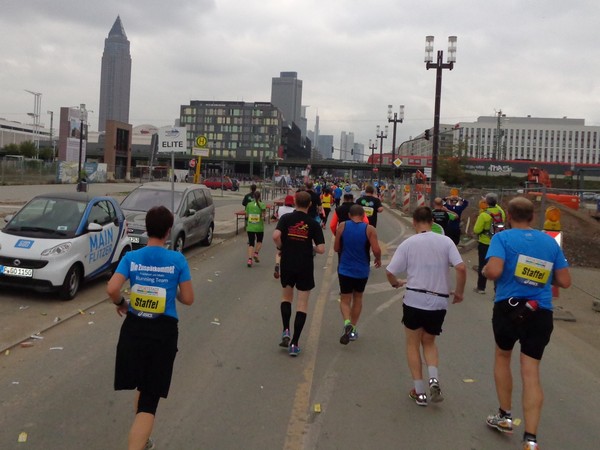 Alle 2,5km gibt es Wasser, alle 5km zusätzlich Iso, Tee, Bananen, so lässt es sich aushalten. In Niederrad bei km19 erfolgt der nächste Staffelwechsel, ähnlich elegant gelöst wie zuvor. Vom Moderator erfahren wir, dass der Sieger Mark Kiptoo (KEN) mit 2:06:49 ins Ziel gekommen ist, und dass Arno Gabius bei seinem ersten Marathon mit 2:09:32 Gesamt-9. geworden ist. Der schnellste Deutsche seit langem. Wir fühlen uns unverändert gut, Hannes brauche ich nun nicht mehr zu bremsen, das Tempo hat sich eingependelt.