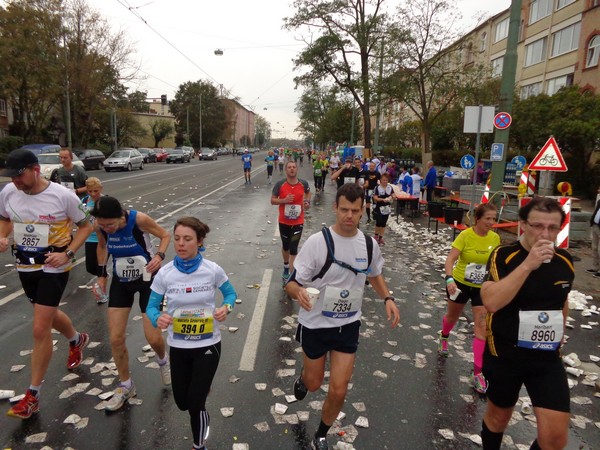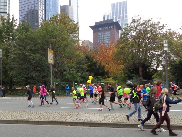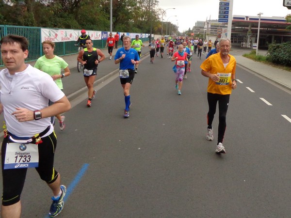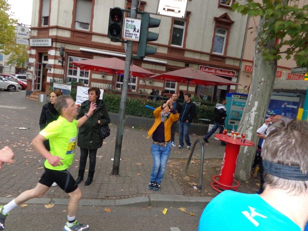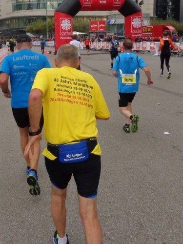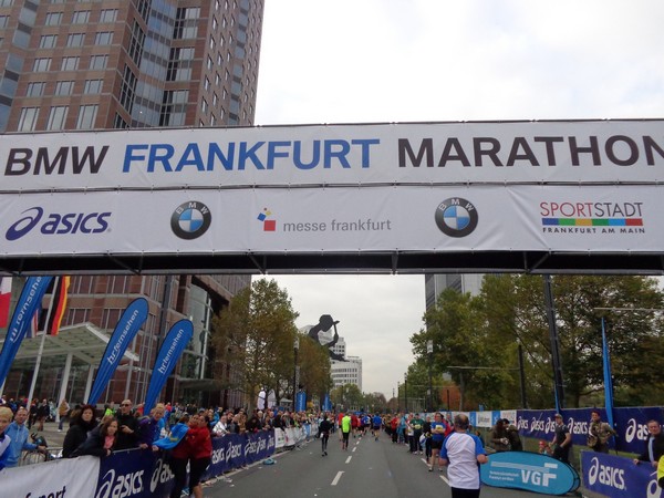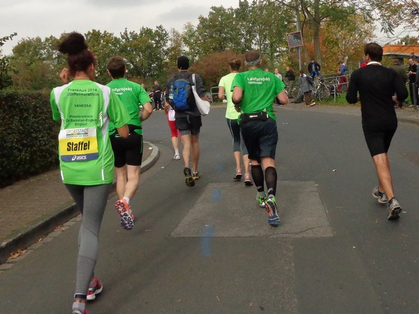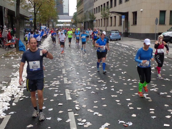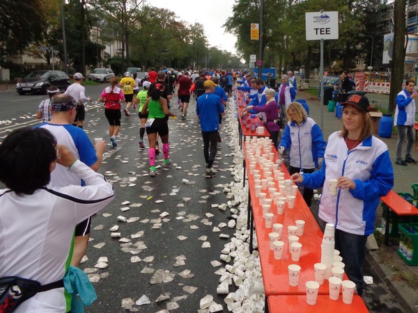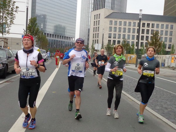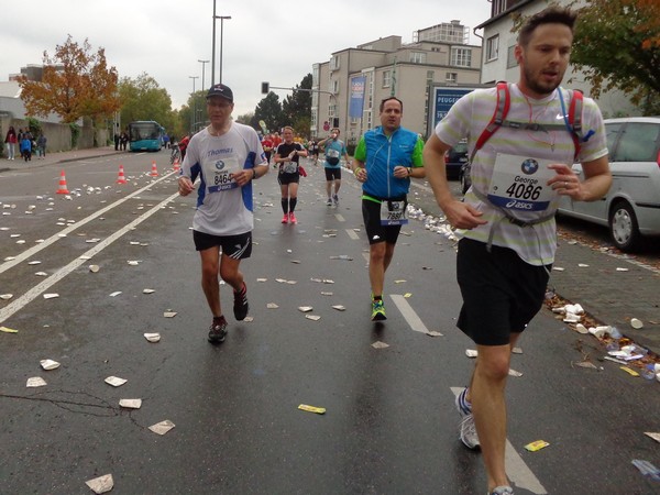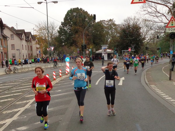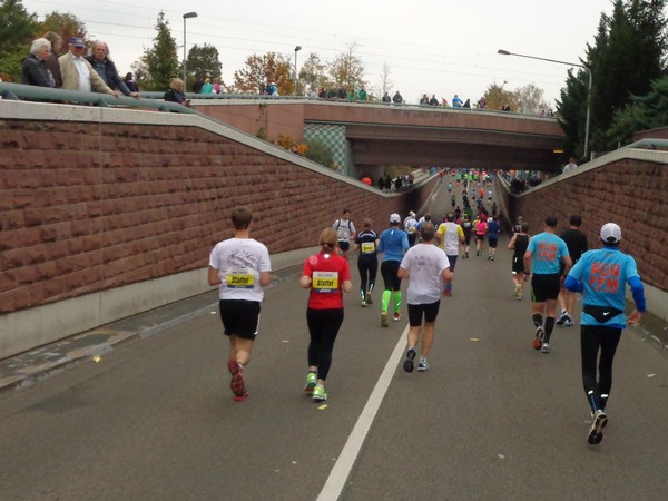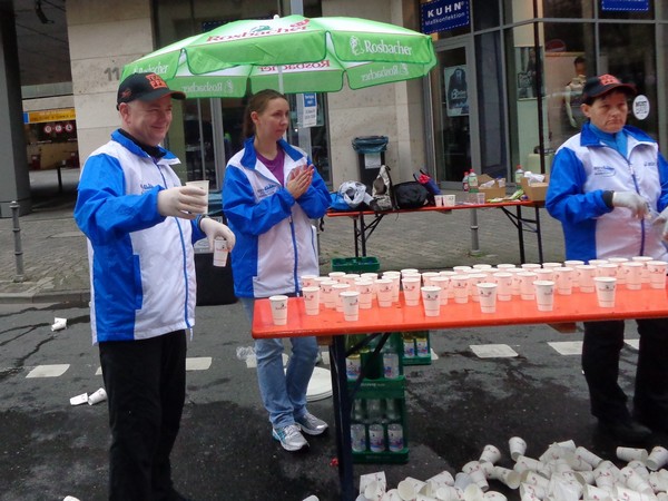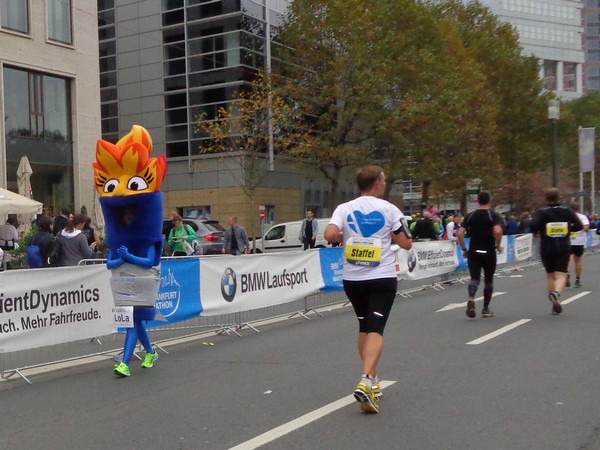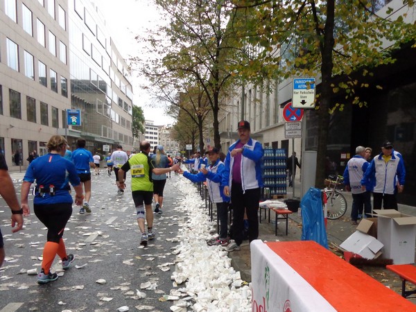 Alle 2,5km gibt es Wasser, alle 5km zusätzlich Iso, Tee, Bananen, so lässt es sich aushalten. In Niederrad bei km19 erfolgt der nächste Staffelwechsel, ähnlich elegant gelöst wie zuvor. Vom Moderator erfahren wir, dass der Sieger Mark Kiptoo (KEN) mit 2:06:49 ins Ziel gekommen ist, und dass Arno Gabius bei seinem ersten Marathon mit 2:09:32 Gesamt-9. geworden ist. Der schnellste Deutsche seit langem. Wir fühlen uns unverändert gut, Hannes brauche ich nun nicht mehr zu bremsen, das Tempo hat sich eingependelt.