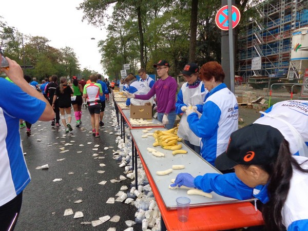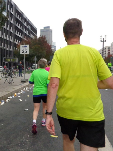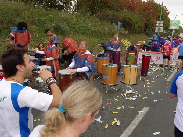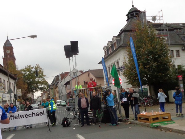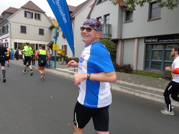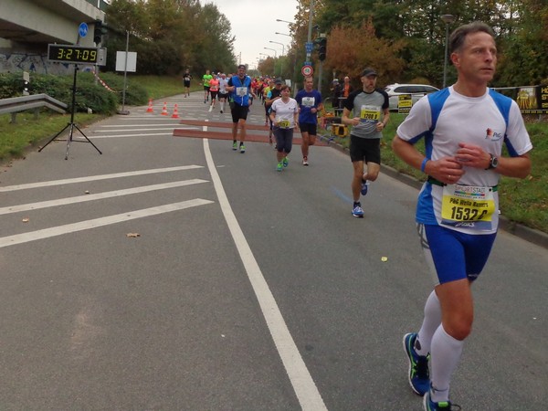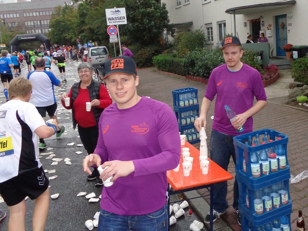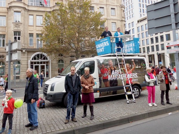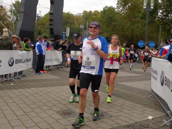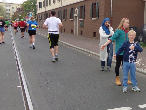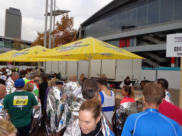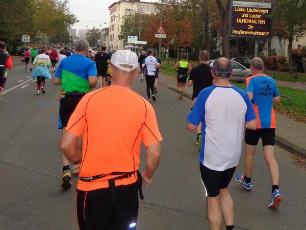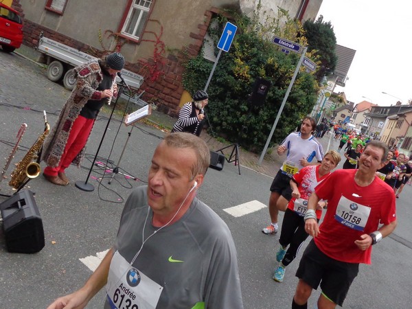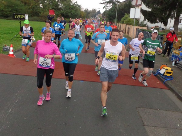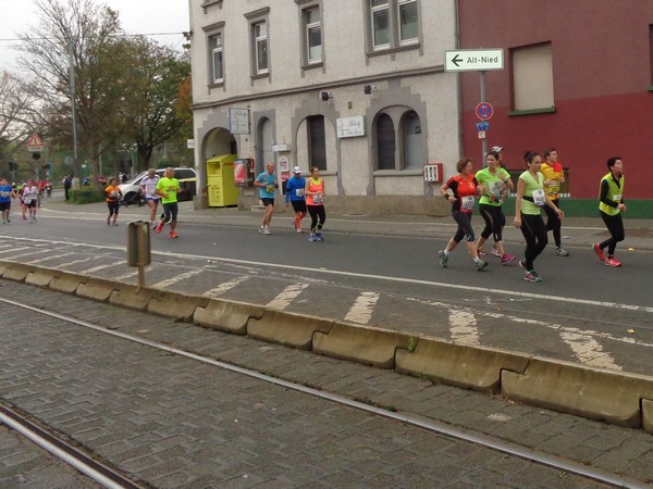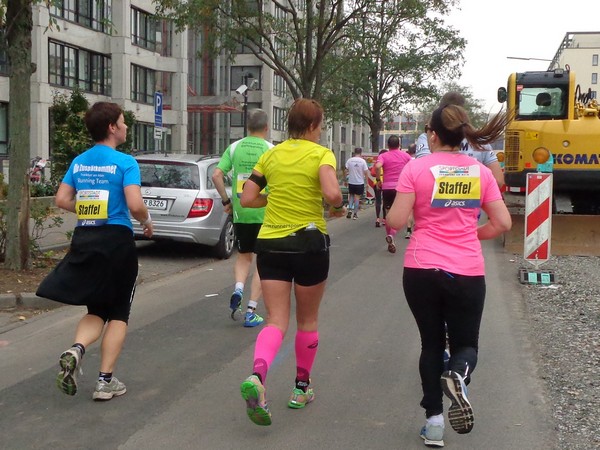 Alle 2,5km gibt es Wasser, alle 5km zusätzlich Iso, Tee, Bananen, so lässt es sich aushalten. In Niederrad bei km19 erfolgt der nächste Staffelwechsel, ähnlich elegant gelöst wie zuvor. Vom Moderator erfahren wir, dass der Sieger Mark Kiptoo (KEN) mit 2:06:49 ins Ziel gekommen ist, und dass Arno Gabius bei seinem ersten Marathon mit 2:09:32 Gesamt-9. geworden ist. Der schnellste Deutsche seit langem. Wir fühlen uns unverändert gut, Hannes brauche ich nun nicht mehr zu bremsen, das Tempo hat sich eingependelt.