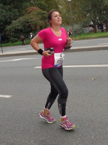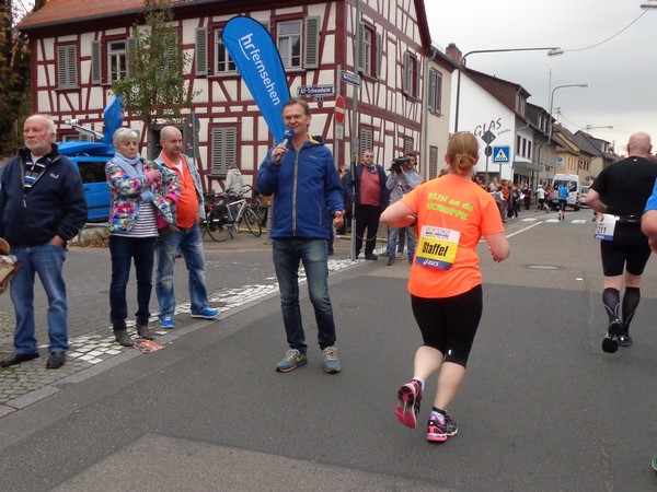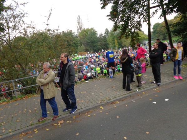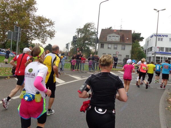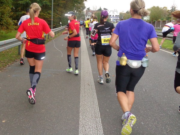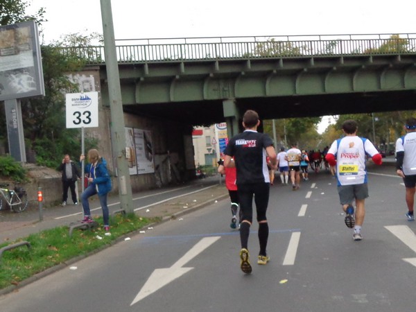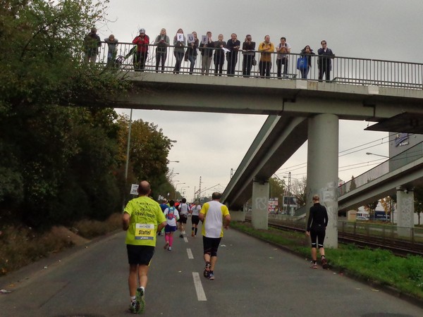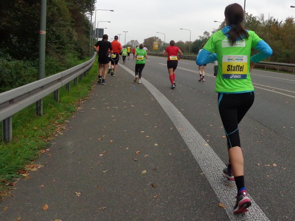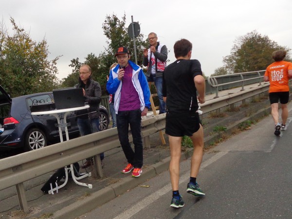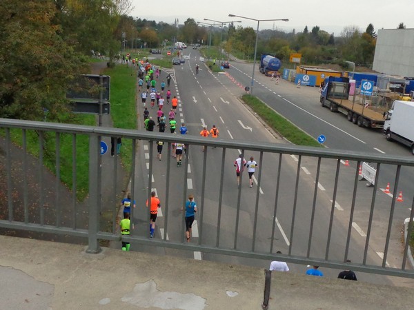 In der Folge werden wir von Anwohnern und Vereinsmitgliedern angefeuert. Eine junge Staffelläuferin kennt hier jeder, über mehrere km wird „Julia“ gerufen, sie winkt zurück. Wir kommen an eine Autobahnauffahrt, eine ansteigende 270°-Kurve. Über uns höre ich, wie der Moderator Marcus Bourcade den 4h29er–Schrittmacher ankündigt. Der ist bei km24, also nur ein paar hundert Meter vor uns, beziehungsweise ein paar Meter über uns auf der Brücke.