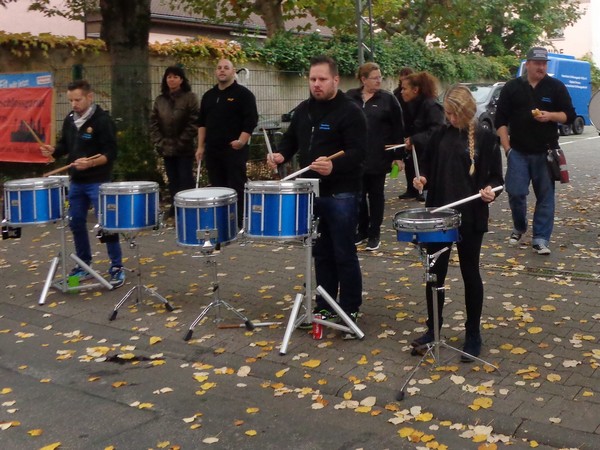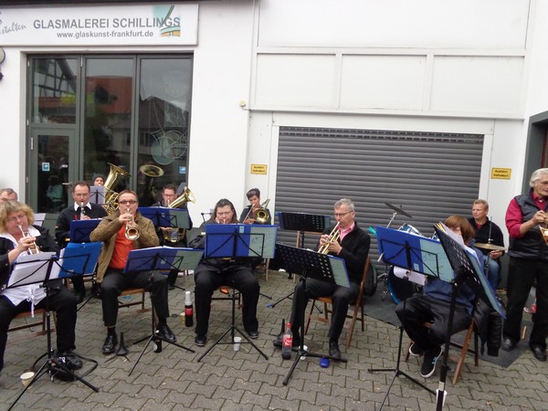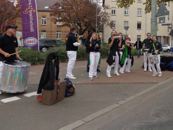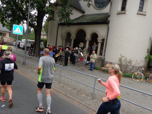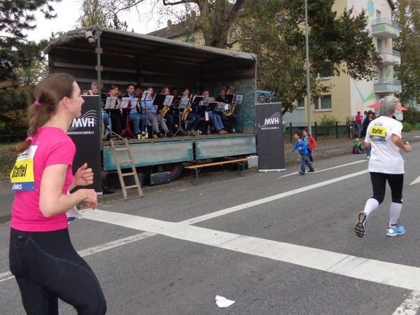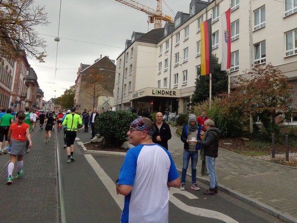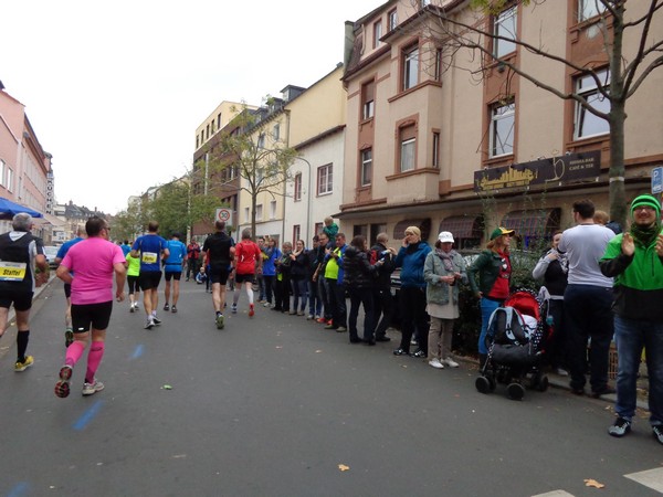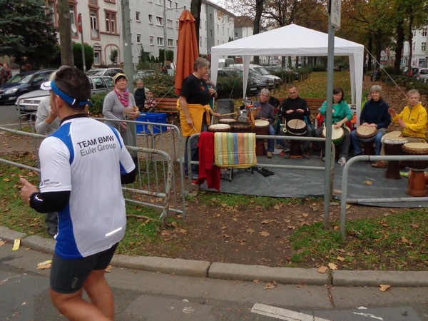 Je näher wir der Innenstadt kommen, umso mehr Zuseher stehen entlang der Strecke. Auch die Musikgruppen werden mehr, oder spielen sie hier lauter, so wie die Women on Drums. Bei km34 verlassen wir die Mainzer Landstraße, und laufen in dicht verbautes Gebiet. Eine dauergeparkte E-Lok mit Mitropa-Waggon hat hier ihre Endstation gefunden.