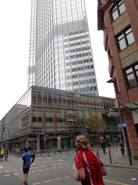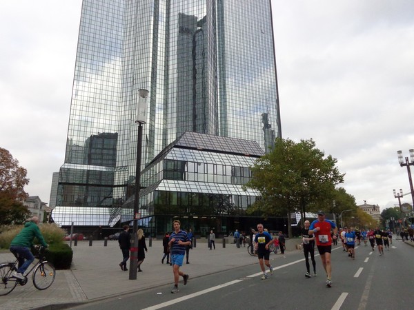 Km13, auf der Alten Brücke geht es über den Main, ich schaue nach rechts und erblicke die Wolkenkratzer der Banken. Der Anblick erinnert mich sehr an den Londoner Financial District, wenn man bei km20 über die Tower Bridge läuft. Kein Wunder, dass es keine Zinsen mehr gibt. Die Erhaltung dieser Hochhäuser muss ein Heidengeld verschlingen. Wir biegen rechts ab und laufen nun am linken Mainufer.
