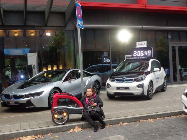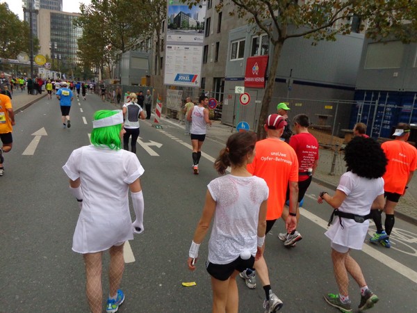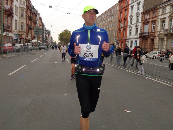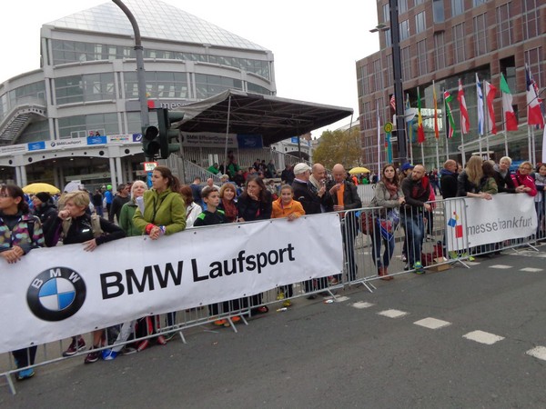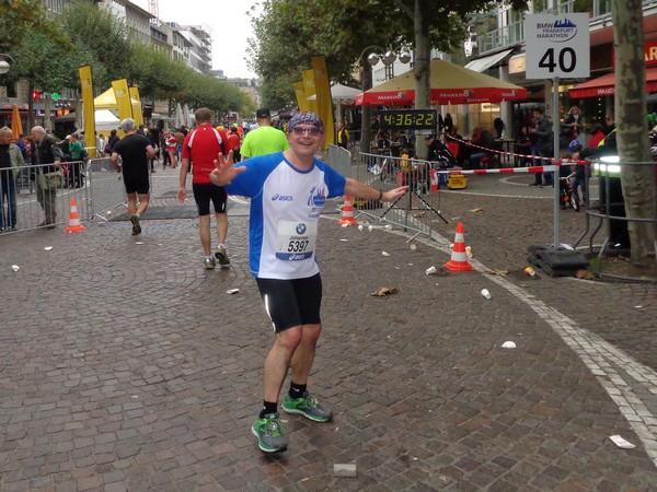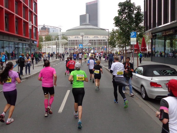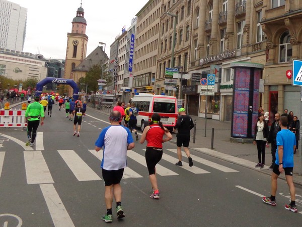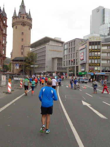 Linker Hand vor dem Mövenpick-Hotel parkt eine Flotte E-BMWs. Einer davon hat die heutige Siegerzeit in Leuchtschrift am Dach stehen. Wir überholen Rolf Keßler im Clownskostüm, der ist ein Spezl vom Pumuckl, die treten oft gemeinsam auf, Zeitdruck hat der schon lange keinen mehr. Wir biegen wieder auf die Mainzer Landstraße ein und kommen wenig später auf ein uns bekanntes Streckenstück: km37 und km1 sind fast an ein- und derselben Stelle. Wir wissen, dass wir den Marathon im Sack haben, da wird kein Mann mit dem Hammer mehr kommen. Wir werden das ganz manierlich zu Ende bringen. Verglichen mit der ersten Hälfte haben wir auch kaum an Tempo eingebüsst.