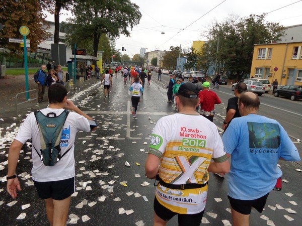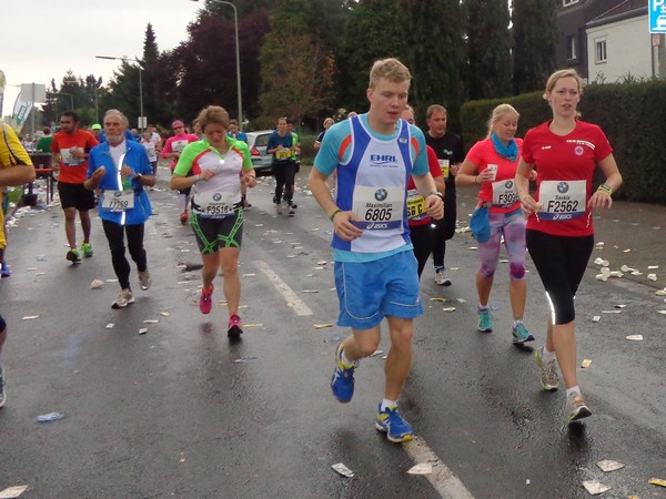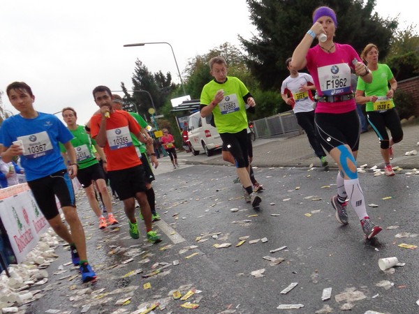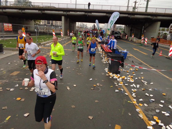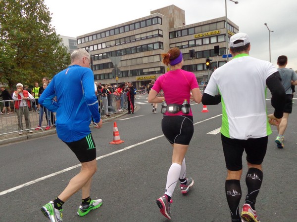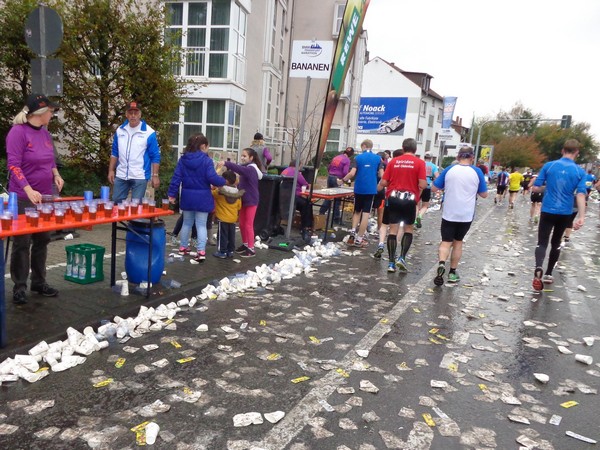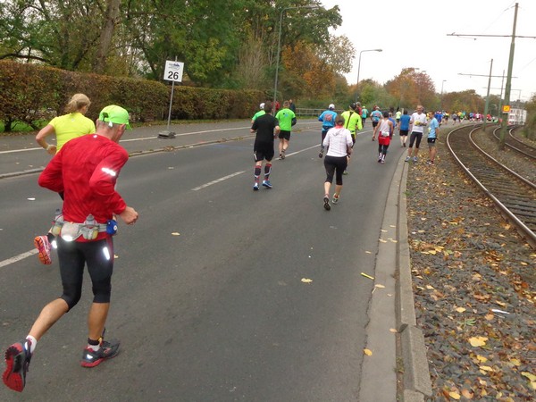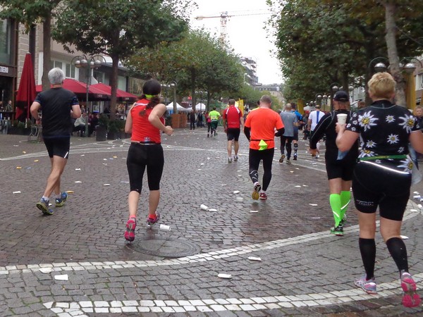 1h34 bei km15, eine vollwertige Labestelle. Die Pappbecher die auf dem Boden gelandet sind, werden von den Schuhen im Wasser zermantscht, bzw. vom Pumuckl durch die Zehen gequetscht. Der läuft ja barfuß. Die Kennedy-Allee raus ist landschaftlich und städtebaulich nicht so herausragend, aber irgendwie müssen wir ja auf 42,195km kommen. Es herrschen perfekte Laufbedingungen: bewölkt, 15°C, ab und zu ein kühlendes Lüftlein, flach und ein Marathonnovize, der auf meinen Rat hört.