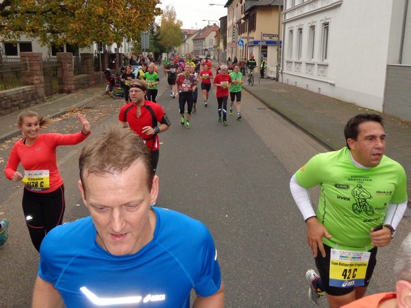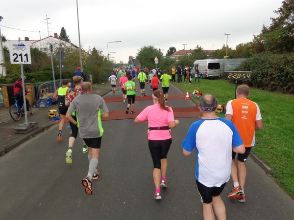 Nach km28 erfolgt der letzte Staffelwechsel. Der Moderator Hubertus Kraus glaubt, Hannes wäre mit Wohnort Erlangen Mittelfranke, so kann man sich irren. Er outet sich selber als Oberfranke. Nach einer Unterführung, km29, laufen wir auf geschlossene Bahnschranken zu, ein Zug braust vorbei. Da müssen wir aber gar nicht weiter, wir biegen vorher rechts ab. Bald erreichen wir die Mainzer Landstraße, der folgen wir nun mehrere km.