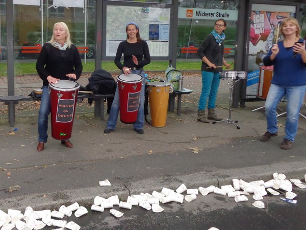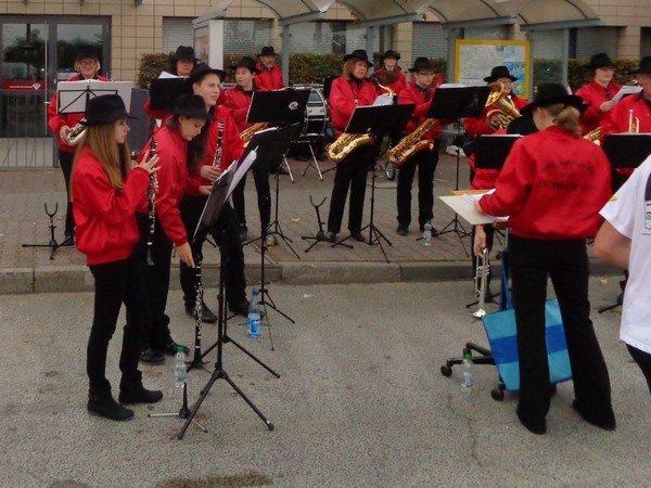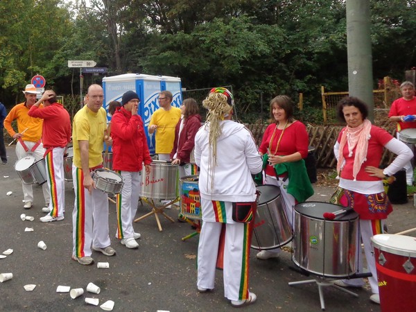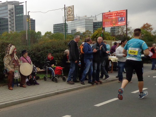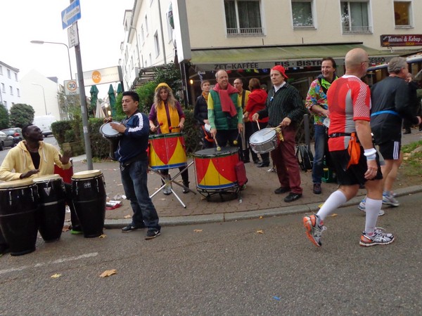 Ein Vorstadt-Indianer sitzt neben seiner Trommel und trommelt nicht, braucht mal eine Pause. Es geht nun unter der Autobahn durch, wir laufen weiter nach Westen, an Schrebergärten vorbei. Bei km20 gibt es nun auch Kohlehydrate von High5, wir greifen zu. Wenig später der Halbmarathon, 133min haben wir dafür gebraucht. Heinz Berg spielt ganz ekstatisch auf seiner Querflöte etwas von Jethro Tull.