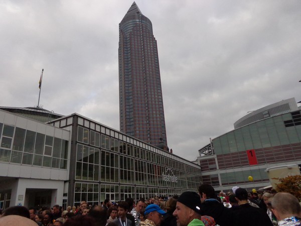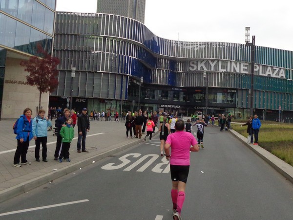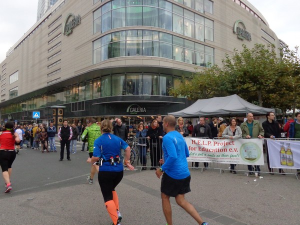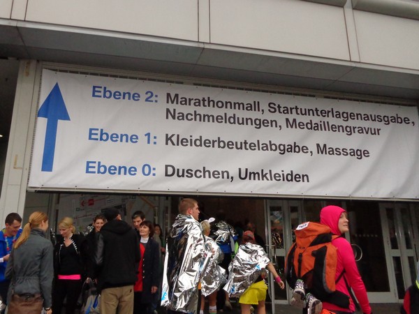 Km35, Europa-Allee, eine üppige Labestelle unter der S-Bahn, mit Blick auf die Fassade des Skyline-Plaza. Kurz davor schwenken wir nach links, da steht groß vor uns „FESTHALLE“. Genau da drin befindet sich die Ziellinie, wir sind aber erst bei km36. „Das ist aber fies“, meint der Läufer in pink neben mir.