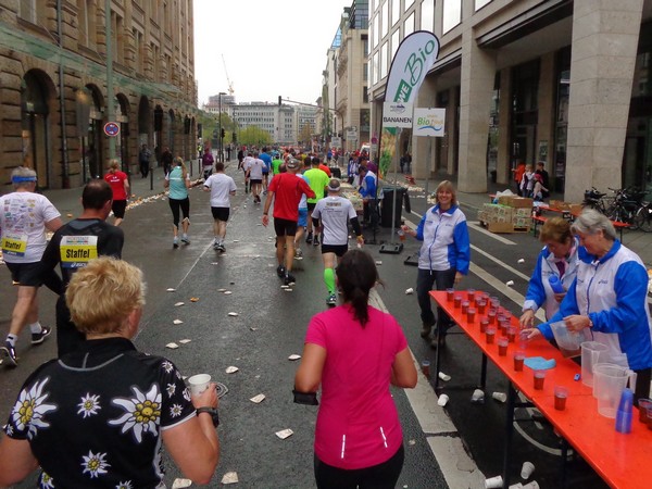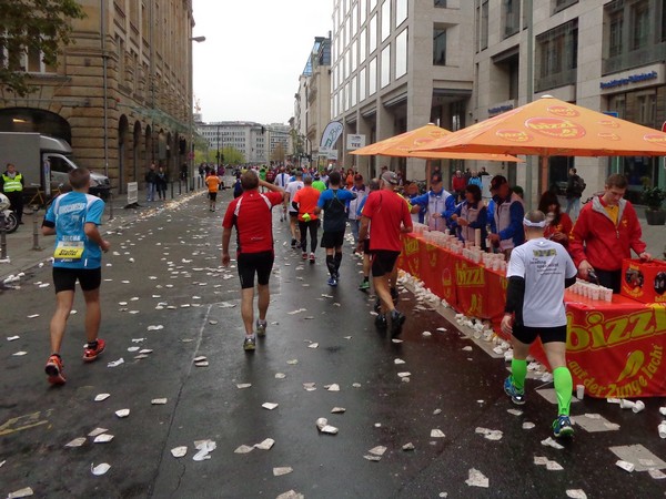 Die ruhende Labe von vorhin ist nun in Betrieb. Kein Gel mehr für uns, nur mehr Iso oder Cola. Wir biegen rechts ein und ich knipse Hannes mit der 40km-Tafel. Kurz hochgerechnet: unter 4h35 sollten wir ihm Ziel sein, der Boden ist sehr rutschig hier. Dafür war er vorhin ab und zu richtig klebrig. Je nachdem, was die Läufer so verschütten.