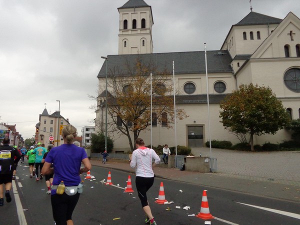 Wir laufen rüber ans rechte Mainufer, aber für drei weitere km stadtauswärts, bei km27 in Höchst die große Wende. Wenig später begegnet uns Desi, sie ist keine 2km hinter uns und macht einen tadellosen Eindruck. Auch bei ihr ist offensichtlich alles im grünen Bereich.