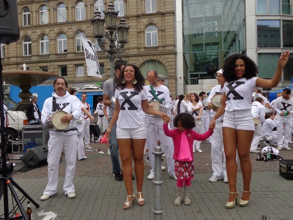Die Läufer links von uns in Gegenrichtung sind bereits bei km41. Dort sehe ich den 4h15-Ballon. Bei der Oper biegen wir rechts ab, ein Moderator unterhält die Zuseher. Wieder der leichte Anstieg zum Roßmarkt, wieder geht es in Folge bergab und wieder kommen wir am Kaiserplatz mit der großen Sambagruppe vorbei, nun um Tänzerinnen verstärkt.