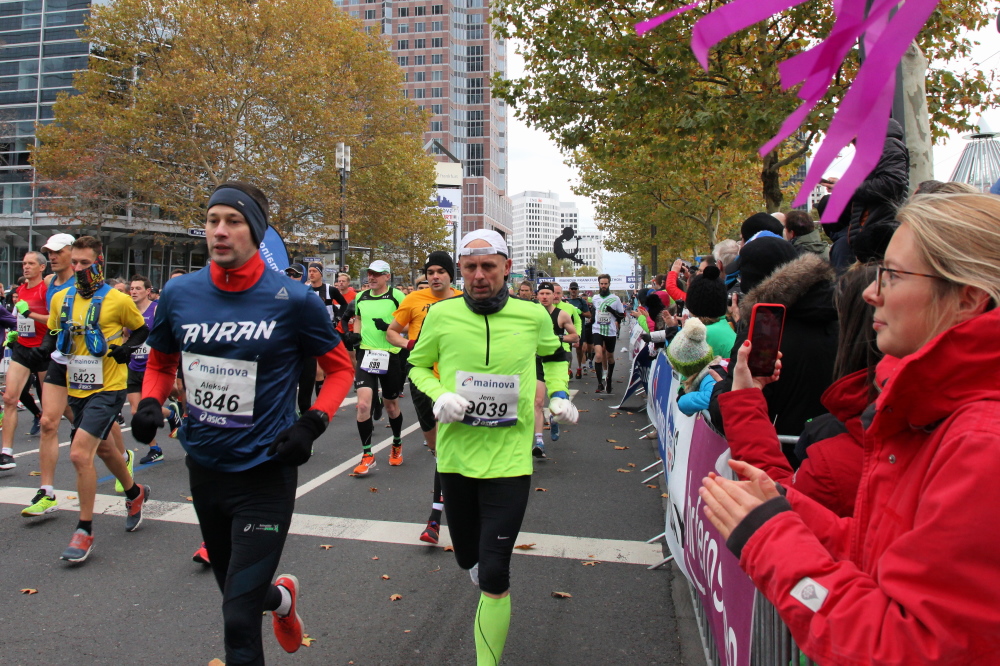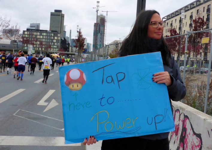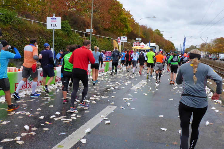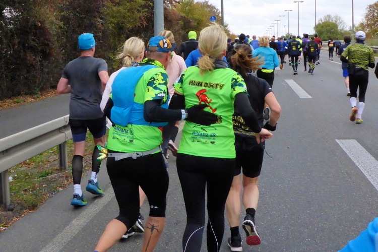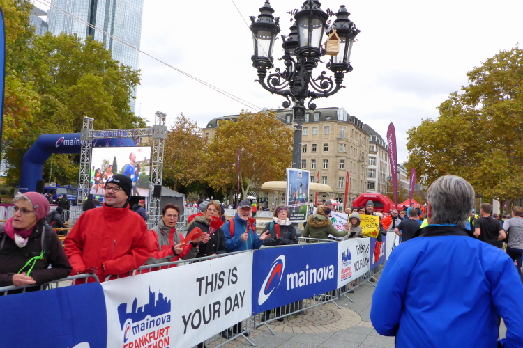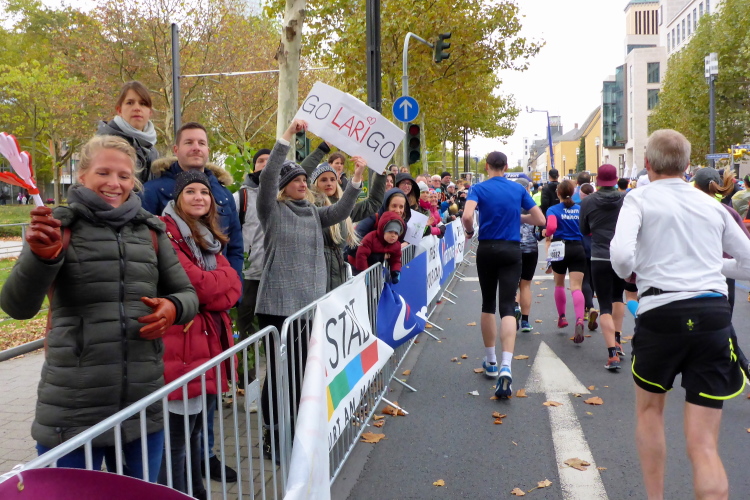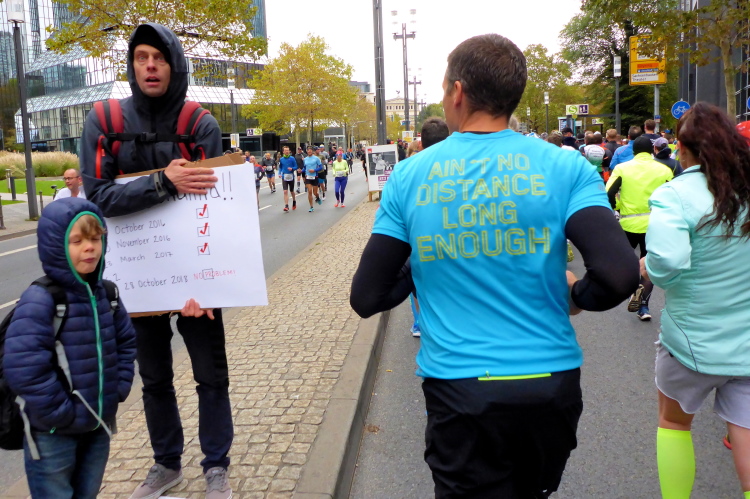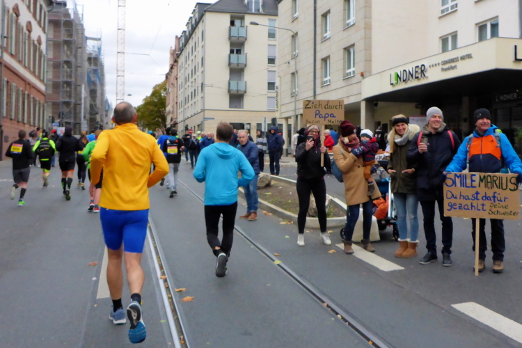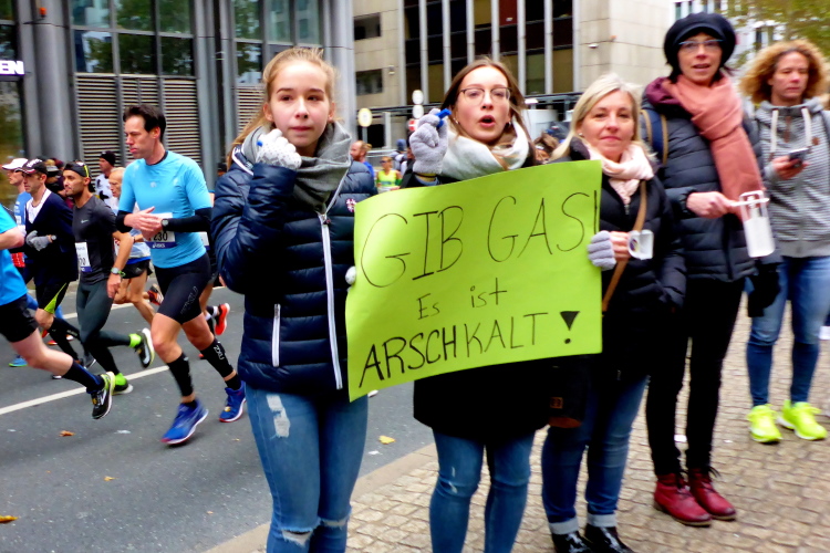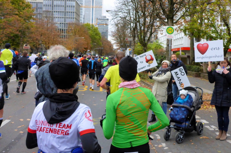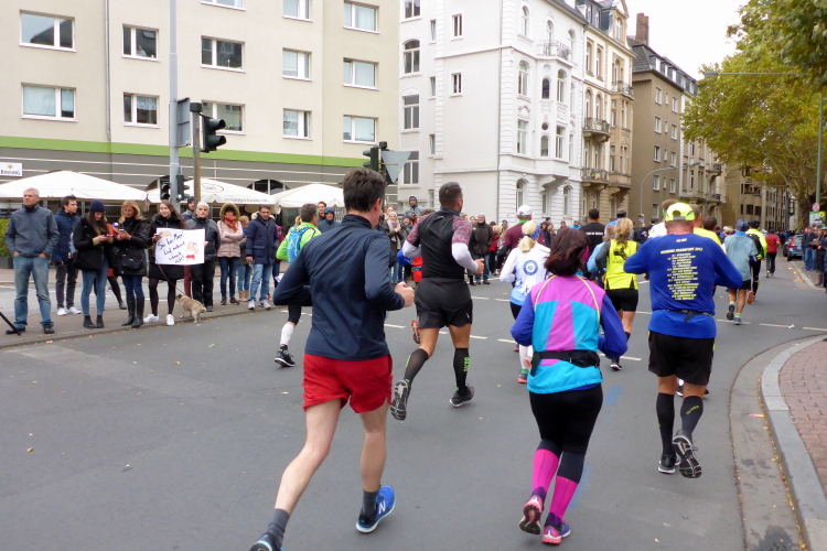 In Nied und Höchst gibt es Streckenpartys der Anwohner. Bei diesem fiesen Wetter nicht ganz so zahlreich und ausgelassen wie sonst, aber die Qualität der Zuschauer ist auffallend gut. Es gibt große Plakate mit neuen, guten Sprüchen. Das „tap here to get energy“ gibt es zu oft. Später lese ich: „ Run like her husband is coming“. Das ist ein Spruch, mit dem man was anfangen kann.