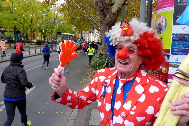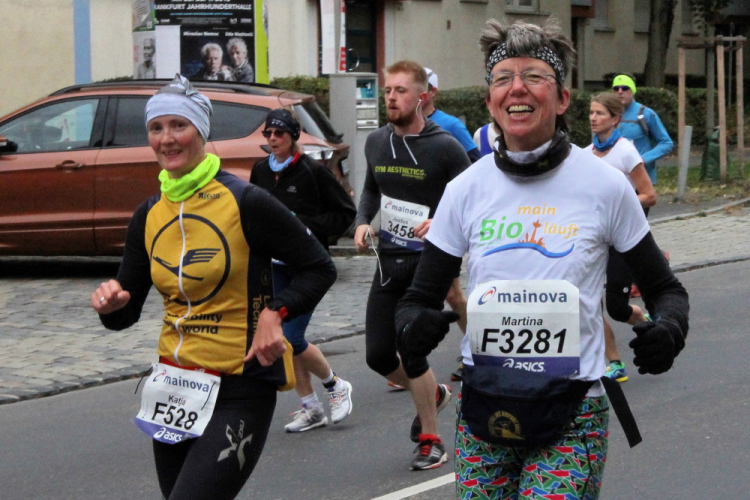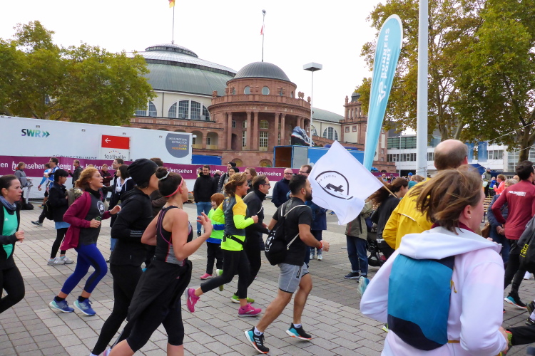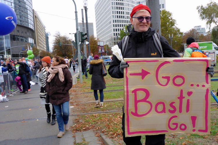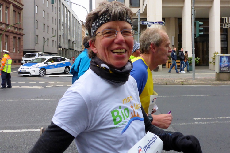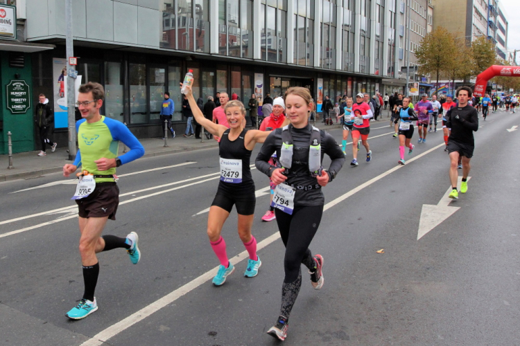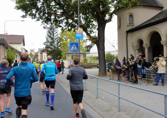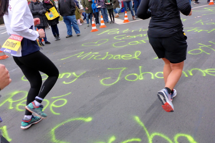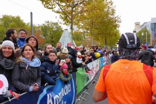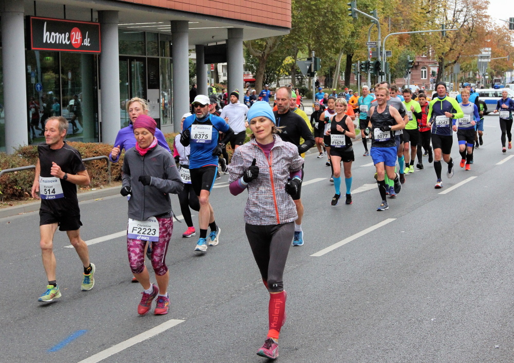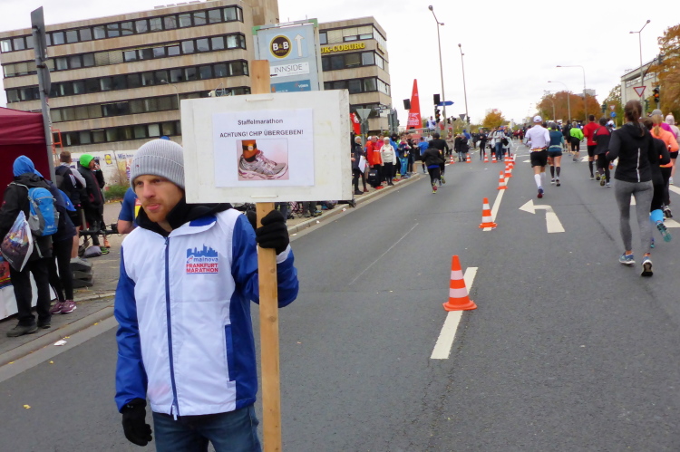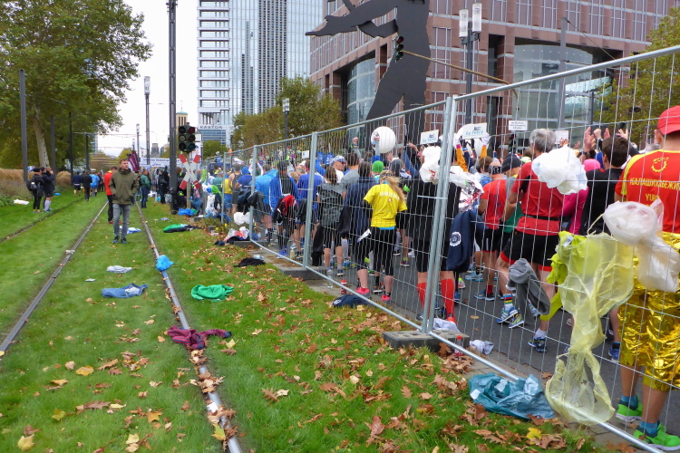 In Nied und Höchst gibt es Streckenpartys der Anwohner. Bei diesem fiesen Wetter nicht ganz so zahlreich und ausgelassen wie sonst, aber die Qualität der Zuschauer ist auffallend gut. Es gibt große Plakate mit neuen, guten Sprüchen. Das „tap here to get energy“ gibt es zu oft. Später lese ich: „ Run like her husband is coming“. Das ist ein Spruch, mit dem man was anfangen kann.