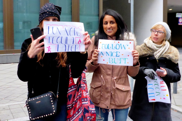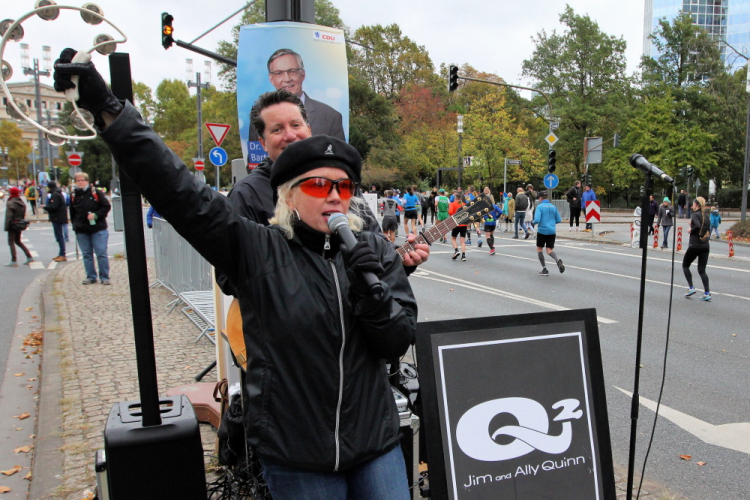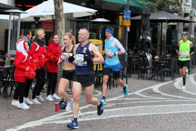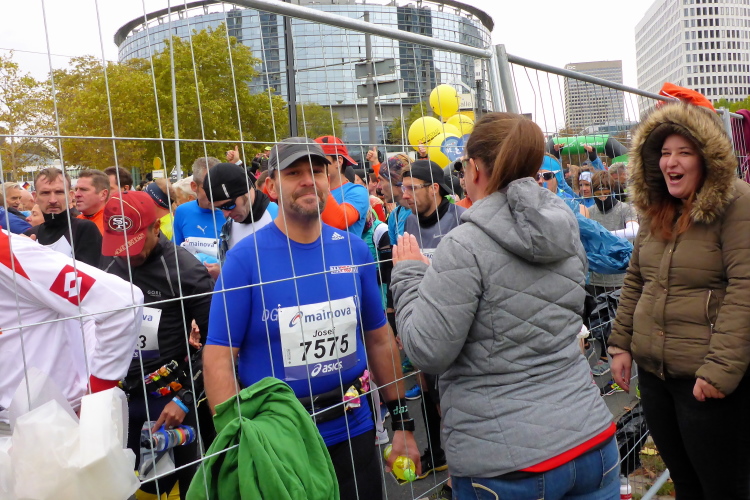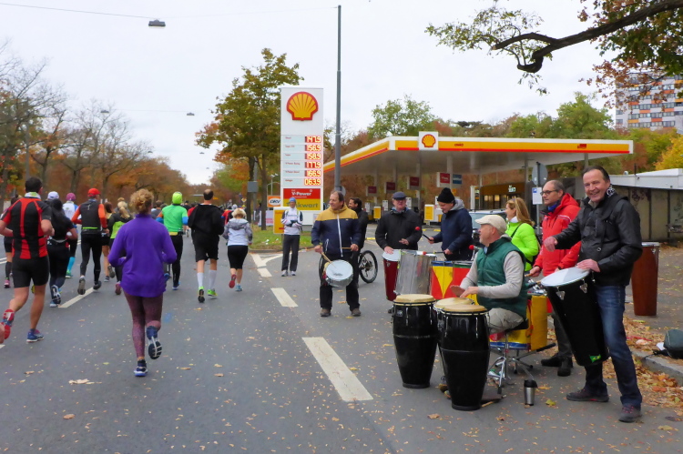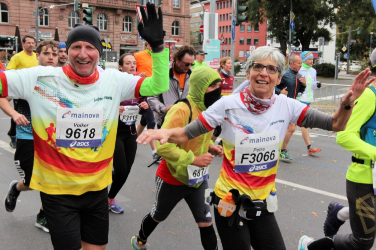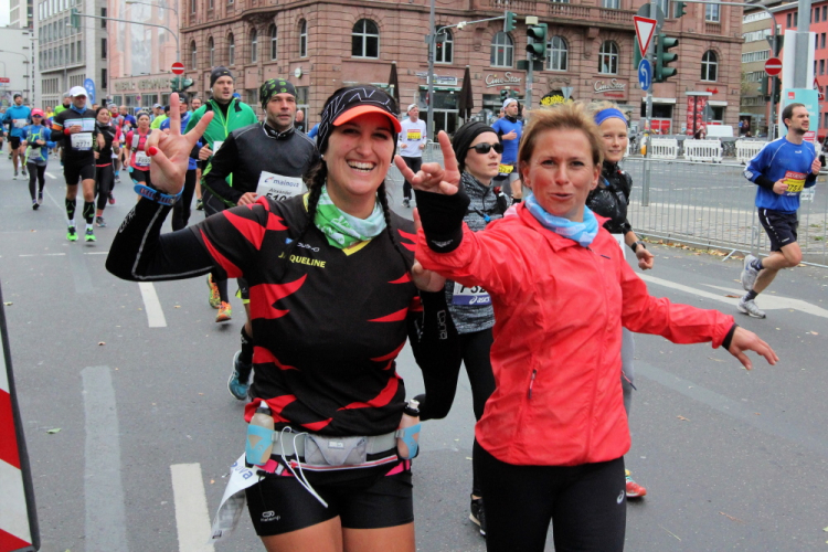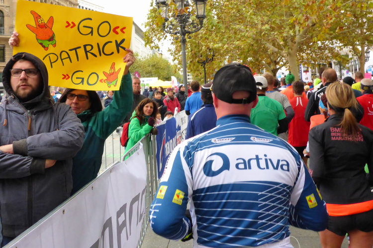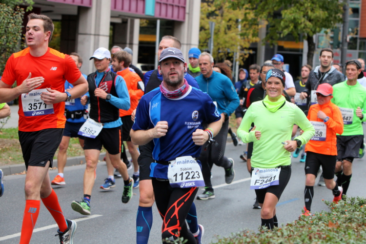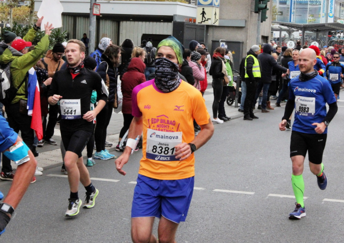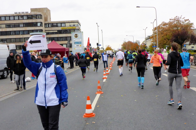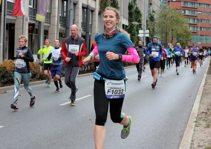In Nied und Höchst gibt es Streckenpartys der Anwohner. Bei diesem fiesen Wetter nicht ganz so zahlreich und ausgelassen wie sonst, aber die Qualität der Zuschauer ist auffallend gut. Es gibt große Plakate mit neuen, guten Sprüchen. Das „tap here to get energy“ gibt es zu oft. Später lese ich: „ Run like her husband is coming“. Das ist ein Spruch, mit dem man was anfangen kann.