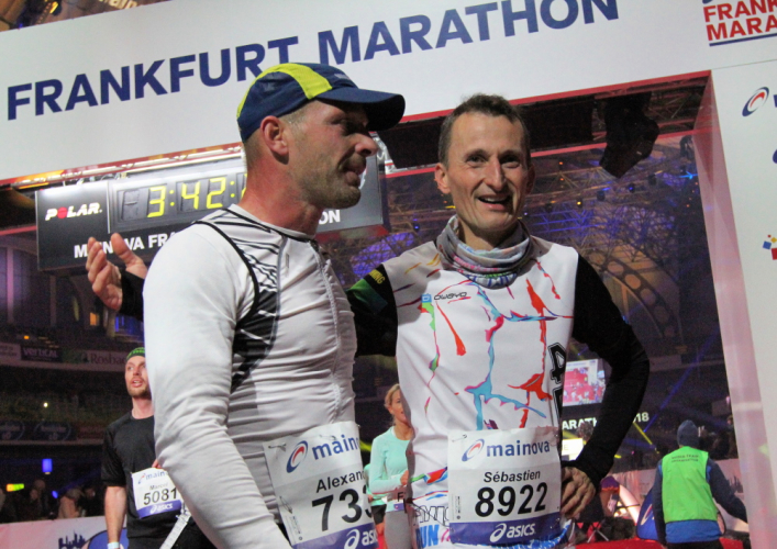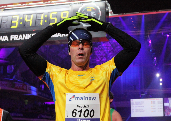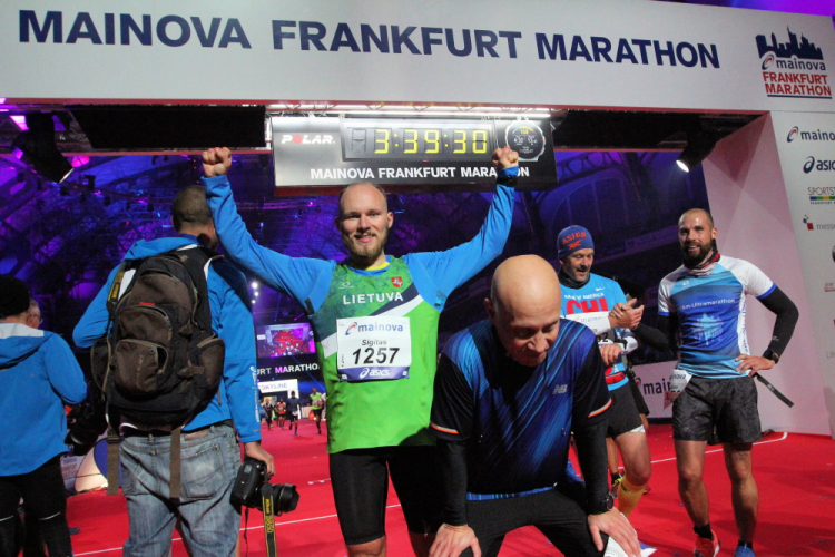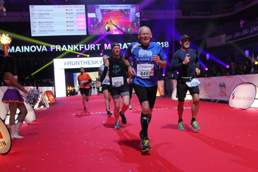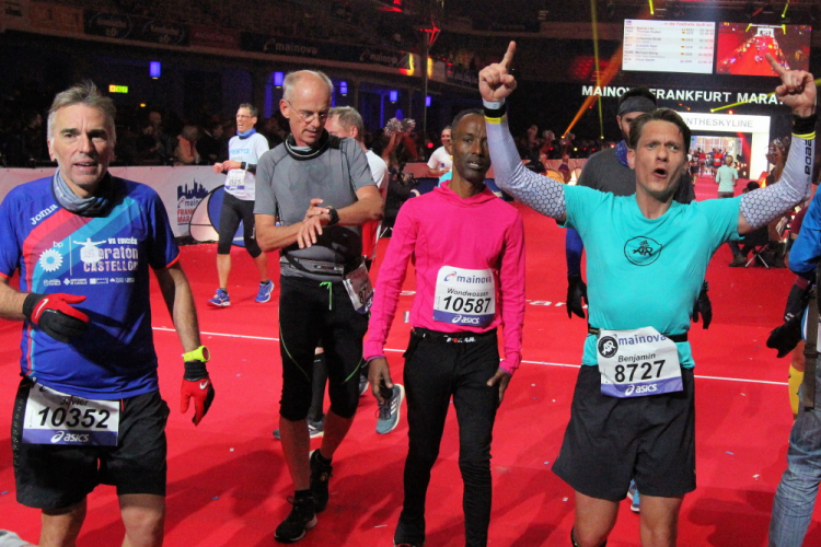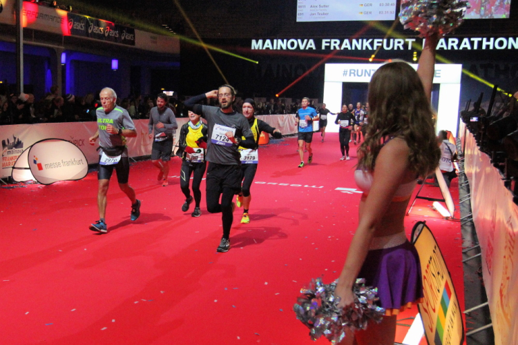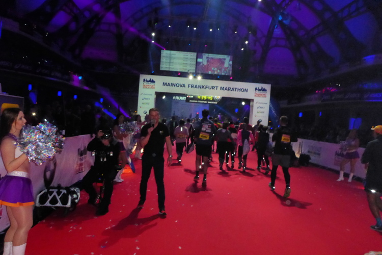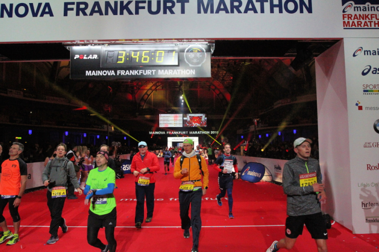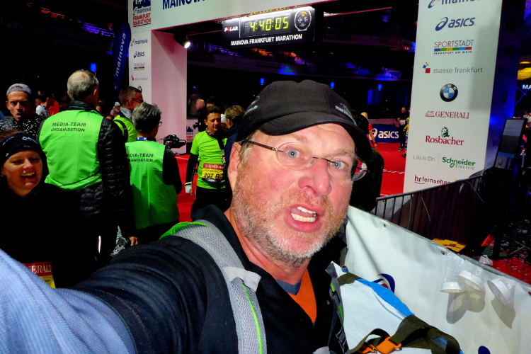 Für mich läuft die Uhr weiter, die 4:15 Pacer überholen. Die letzten Meter durch die Hochhausschluchten von Bankfurt sind spitze. Ermüdungserscheinungen habe ich nicht, die 200 Kilometer durch Portugal letzte Woche warenoffenbar eine gute Vorbereitung.