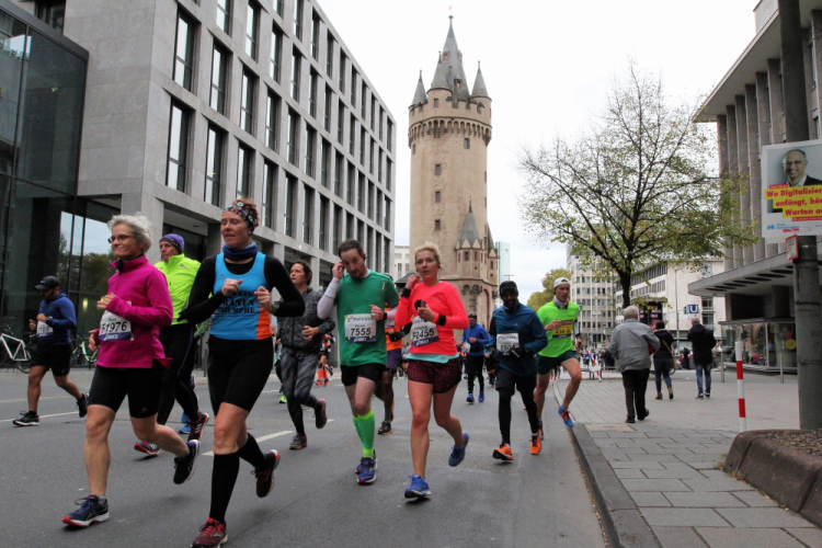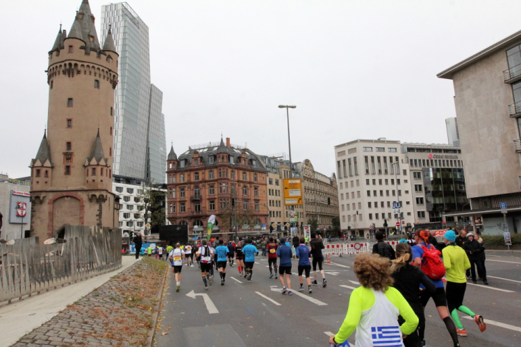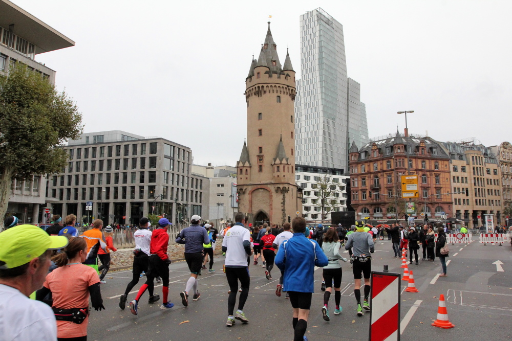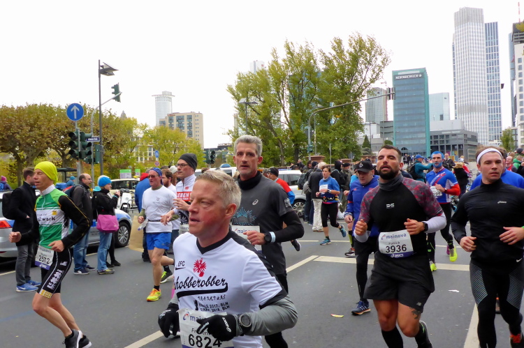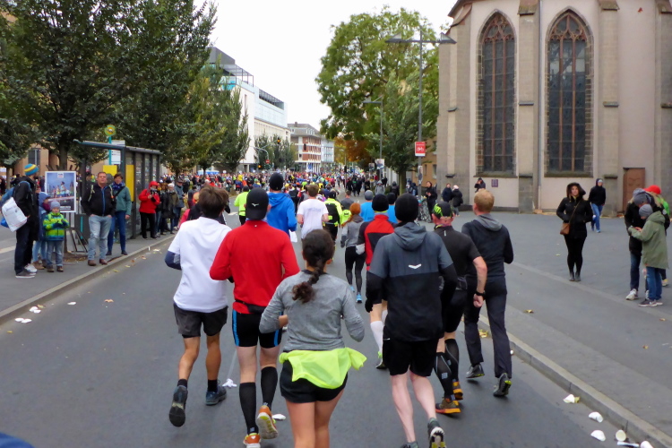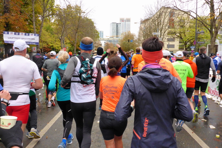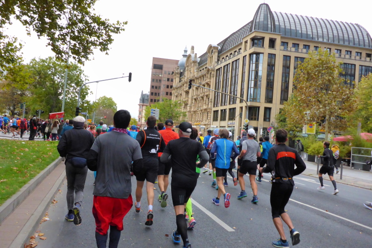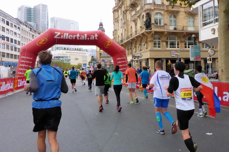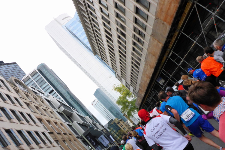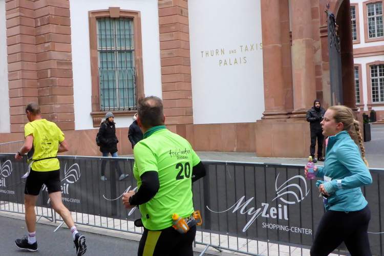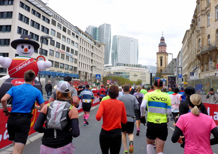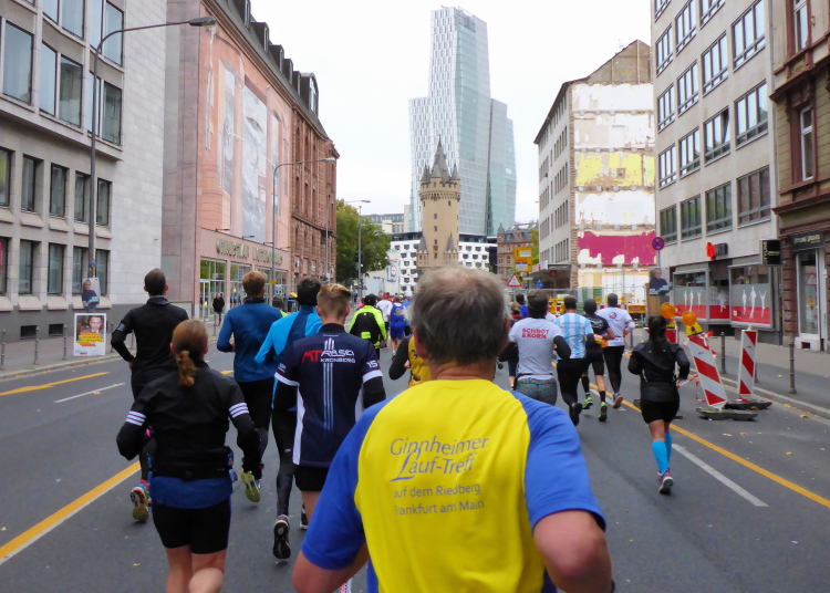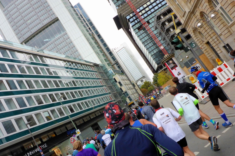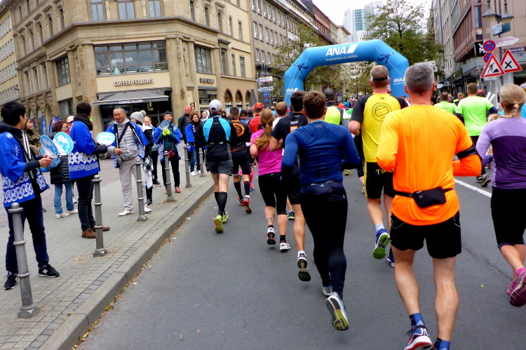 Als ich bei der Hauptwache abbiege, bin ich recht allein. Das liegt an den Blockstarts, es dauert, bis sich die Läufer mischen. Hinter der Börse vorbei, rein in die Freßgass. Die Gasse bekam um 1900 ihren Namen, damals konnten sich Delikatessenläden noch die Miete leisten. Als die U Bahn eröffnet wurde, betrieb Marika Kilius, die Kathi Witt der Vorzeit, hier eine Sektbar