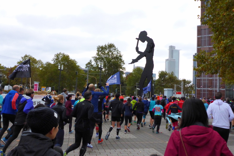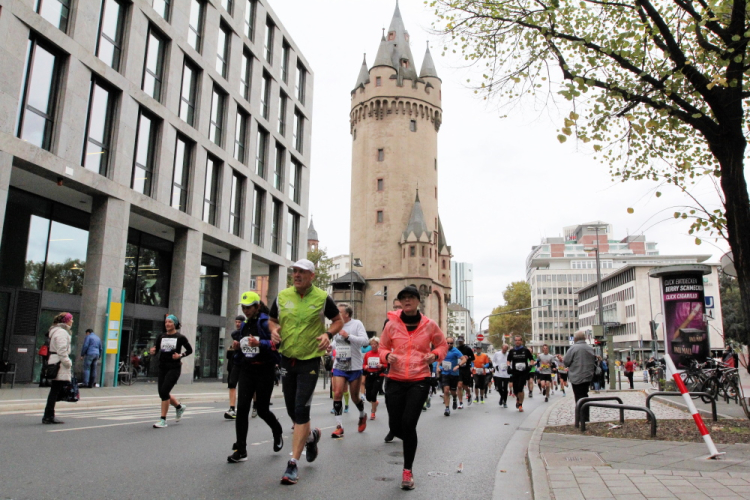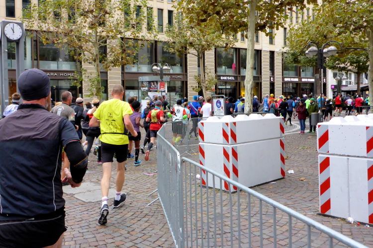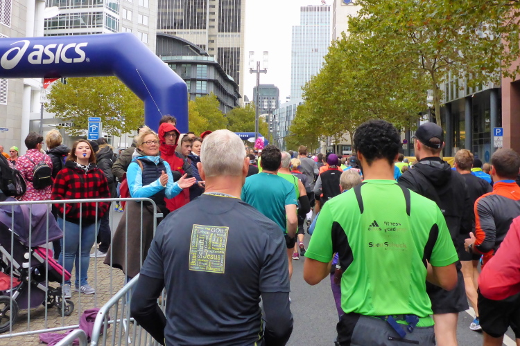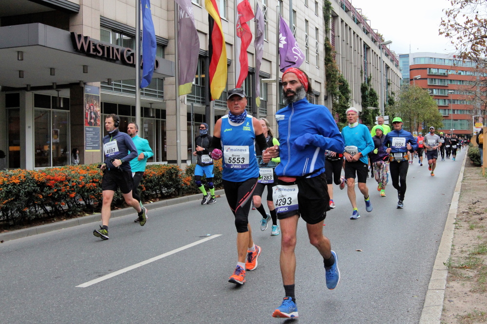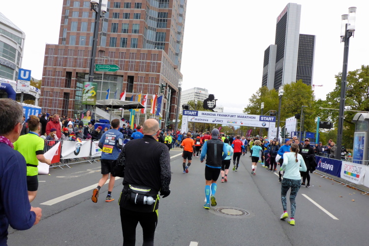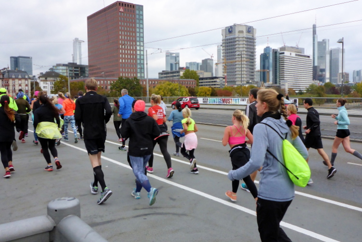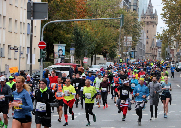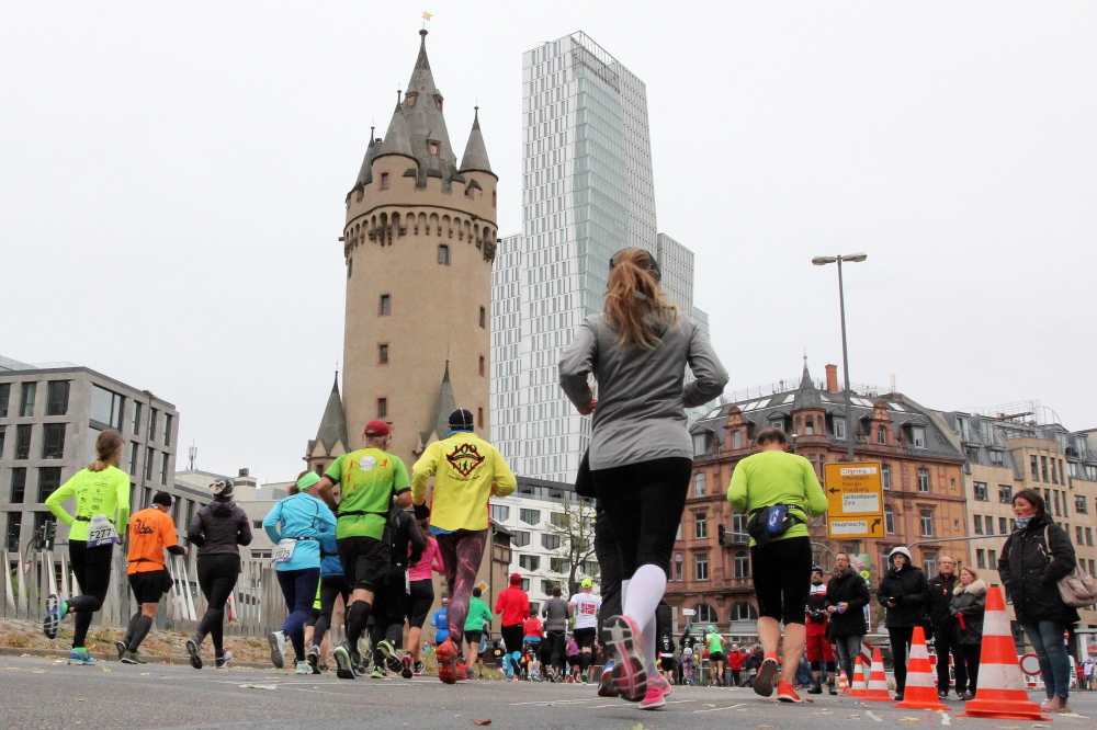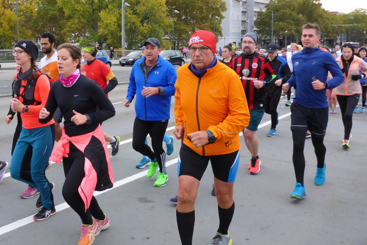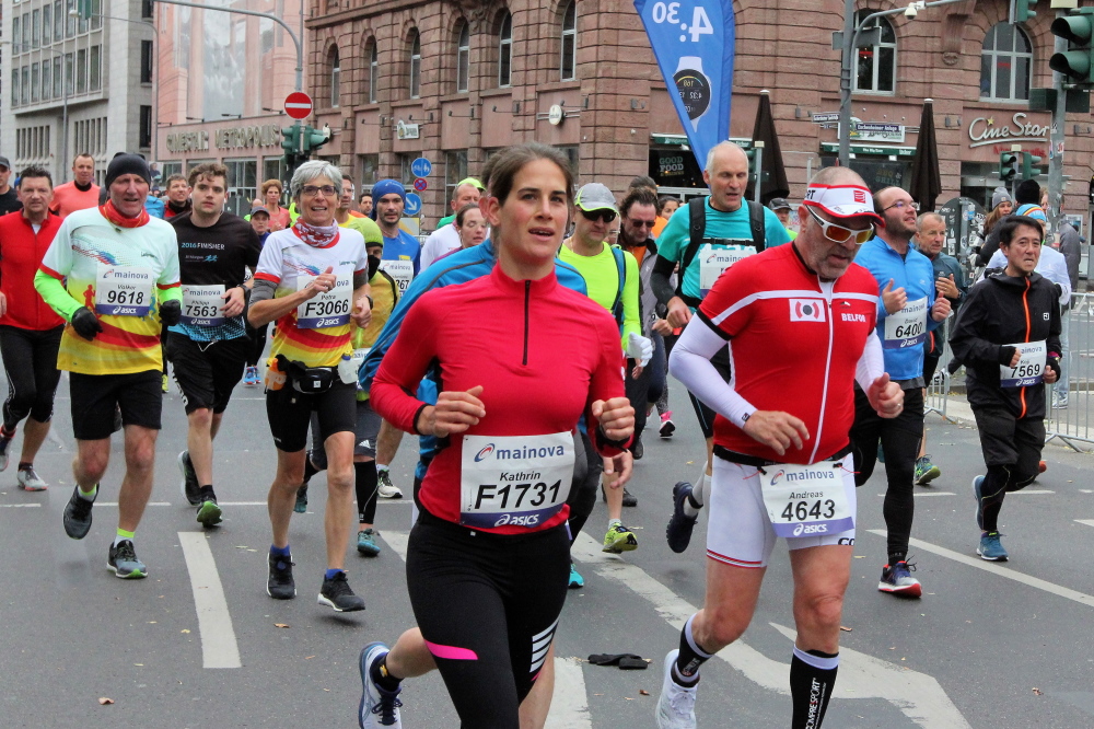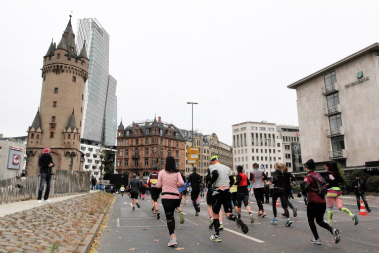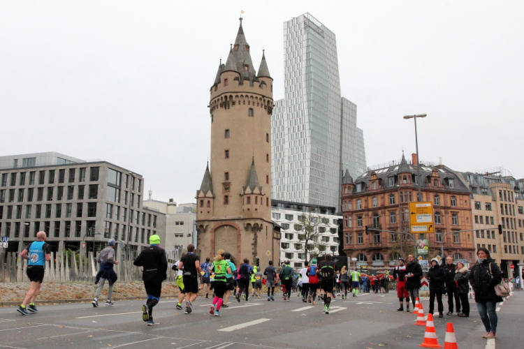 Als ich bei der Hauptwache abbiege, bin ich recht allein. Das liegt an den Blockstarts, es dauert, bis sich die Läufer mischen. Hinter der Börse vorbei, rein in die Freßgass. Die Gasse bekam um 1900 ihren Namen, damals konnten sich Delikatessenläden noch die Miete leisten. Als die U Bahn eröffnet wurde, betrieb Marika Kilius, die Kathi Witt der Vorzeit, hier eine Sektbar