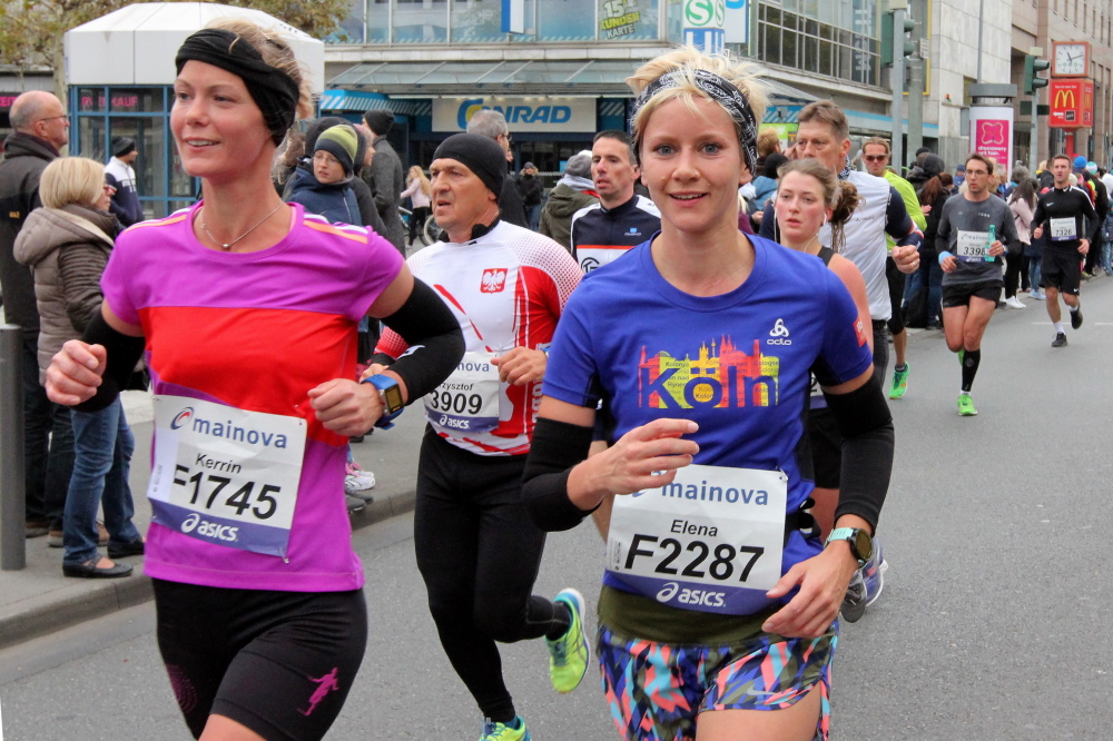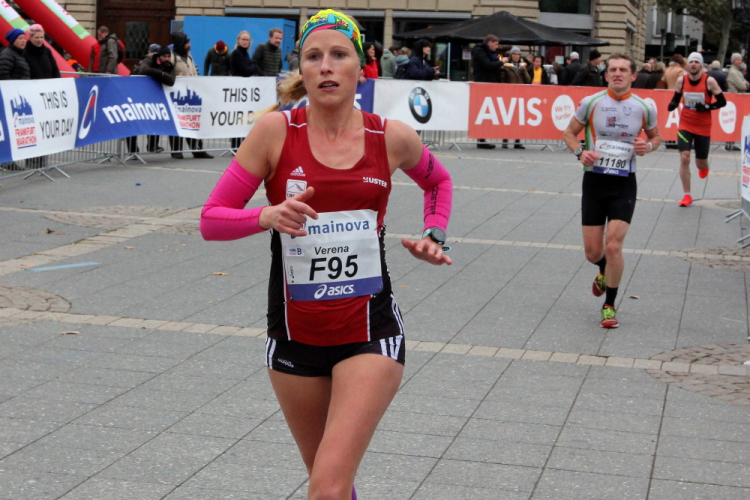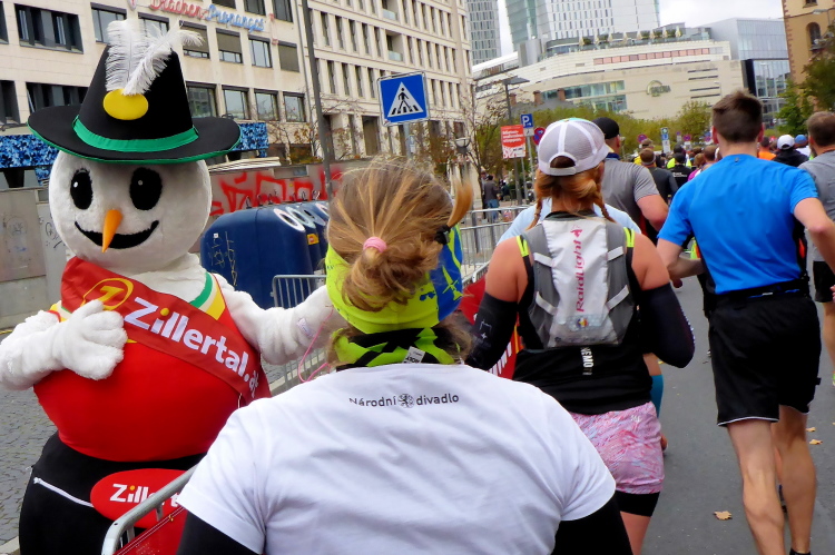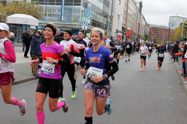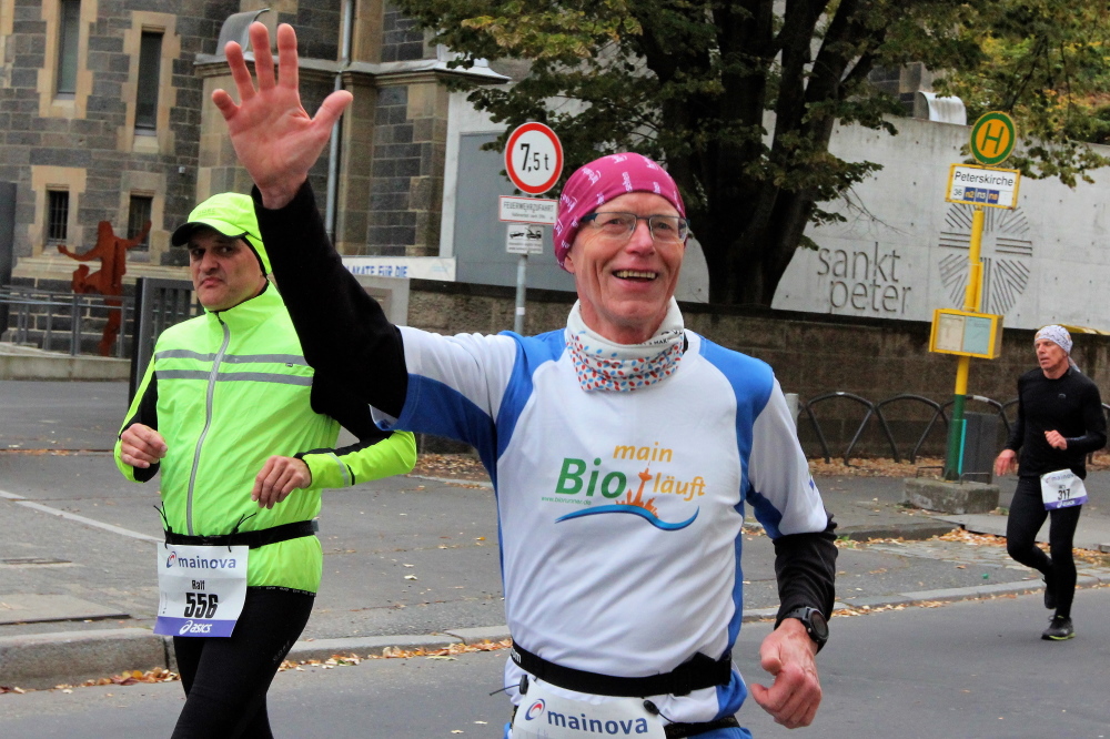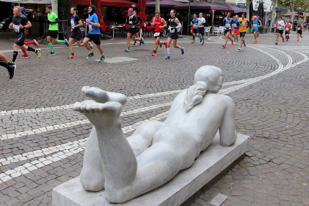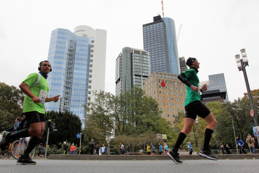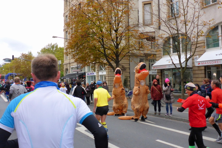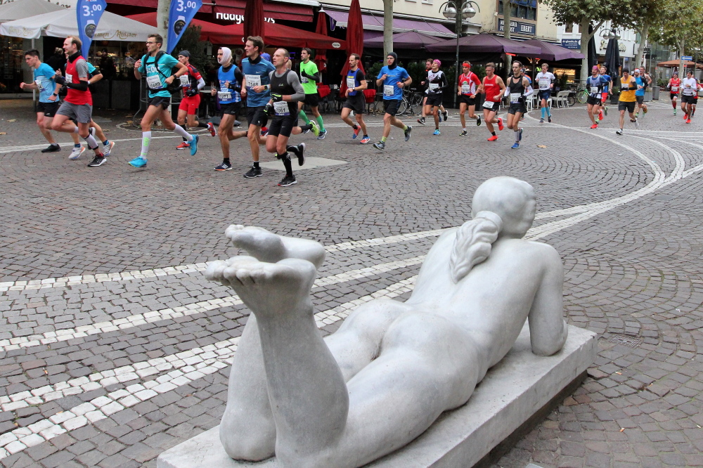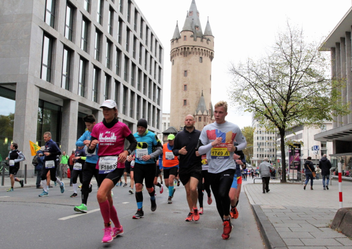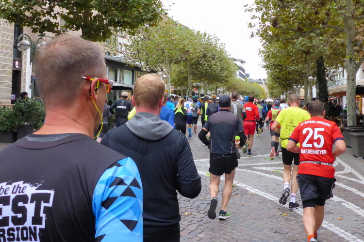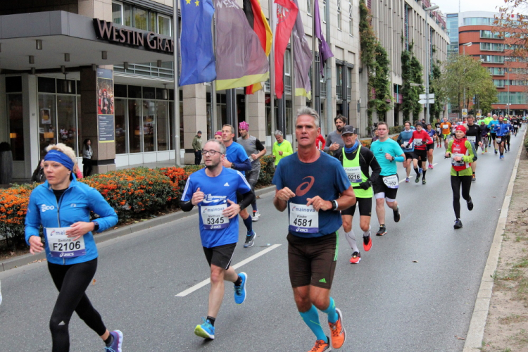 Als ich bei der Hauptwache abbiege, bin ich recht allein. Das liegt an den Blockstarts, es dauert, bis sich die Läufer mischen. Hinter der Börse vorbei, rein in die Freßgass. Die Gasse bekam um 1900 ihren Namen, damals konnten sich Delikatessenläden noch die Miete leisten. Als die U Bahn eröffnet wurde, betrieb Marika Kilius, die Kathi Witt der Vorzeit, hier eine Sektbar