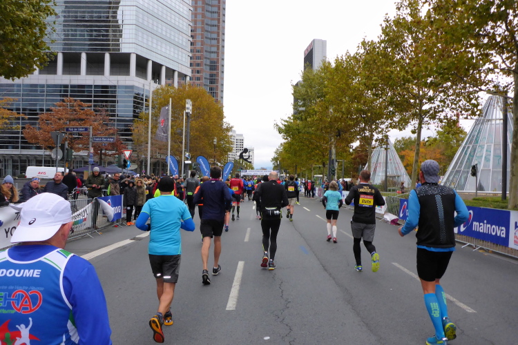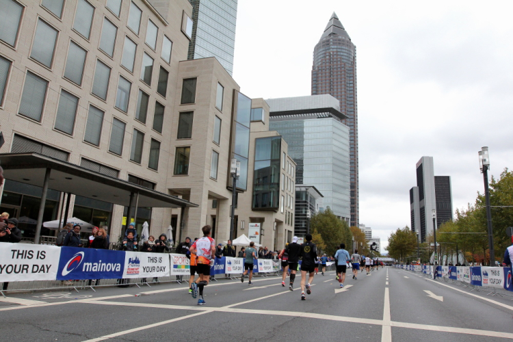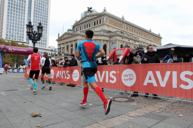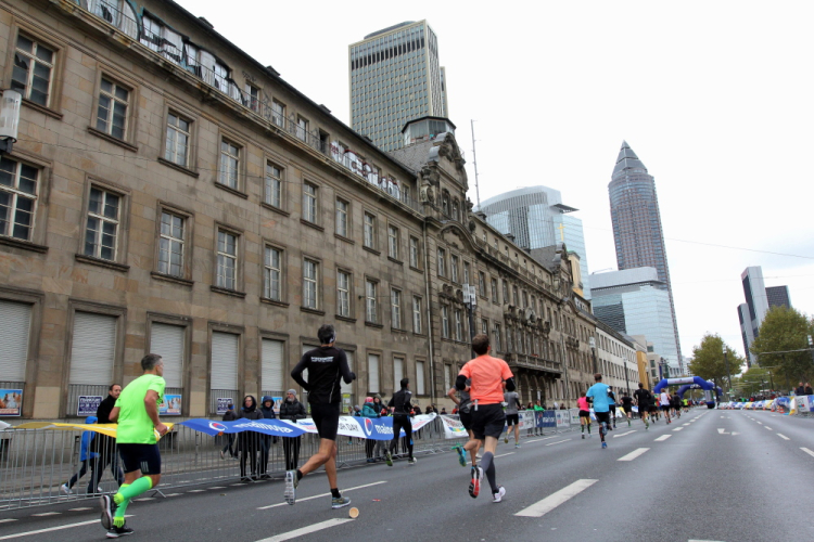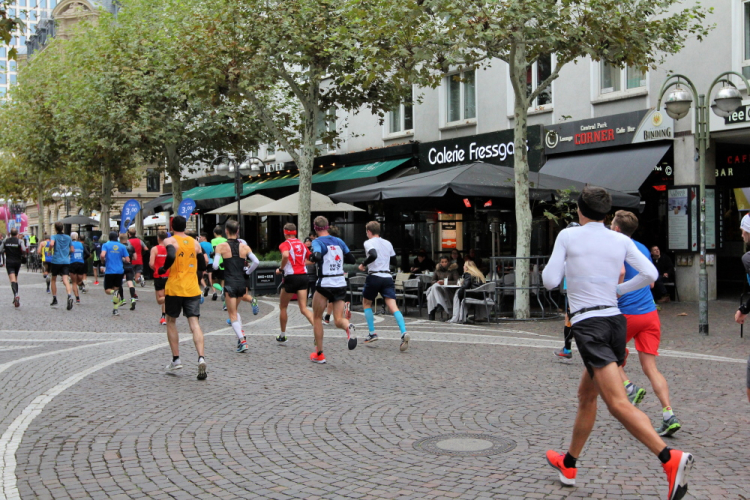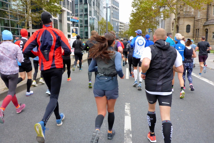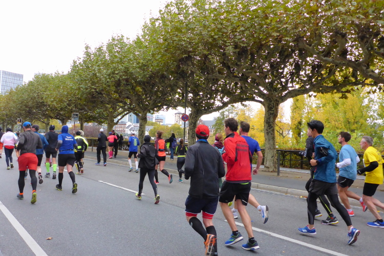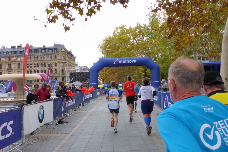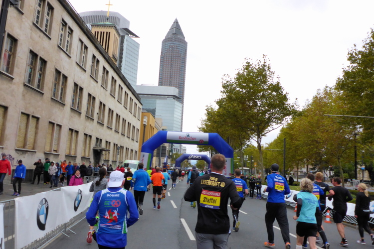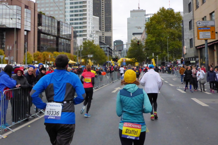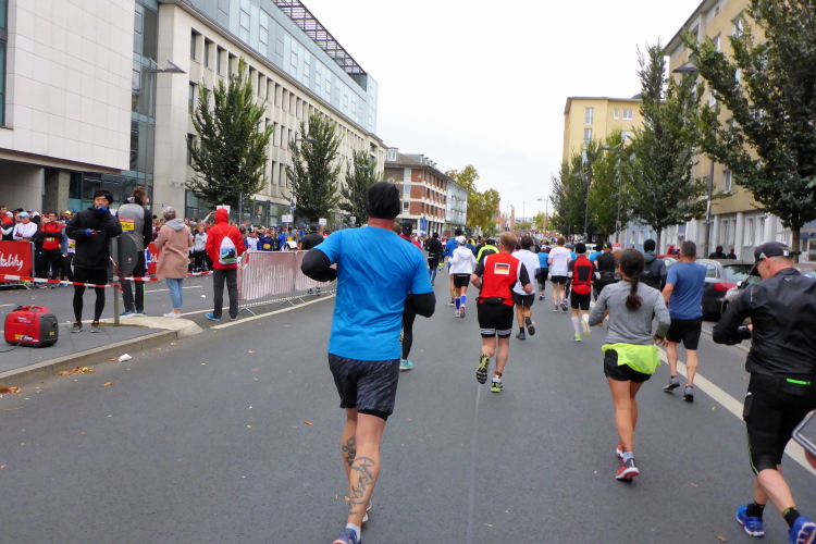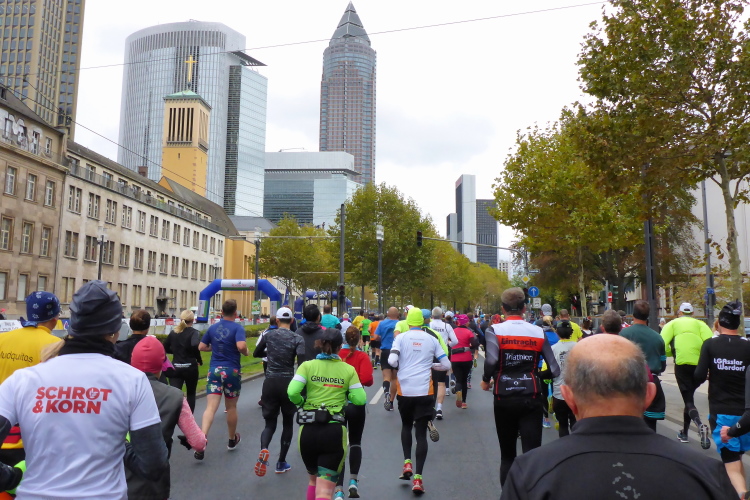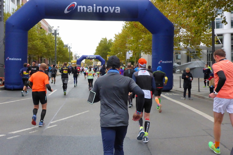 Auf der anderen Seite der Senckenberganlage kommen die Spitzenläufer schon entgegen. 3,5 Kilometer in 11 Minuten? Das will ich auch! Als ich nach der Runde durch die Innenstadt dort ankomme, sind die gegenüberliegenden Startblöcke leer und sämtliche Zuschauer jetzt auf dieser Seite. Ich habe reichlich Körner, fühle mich gut.