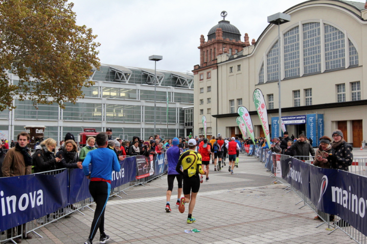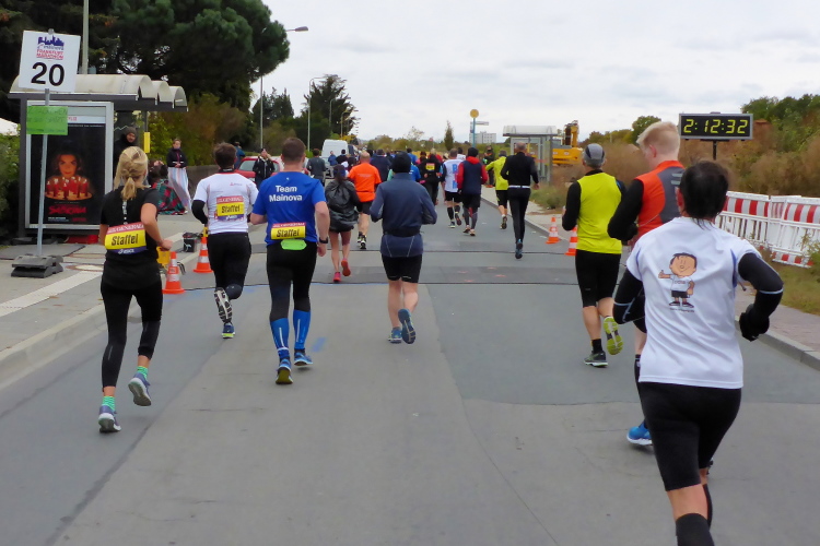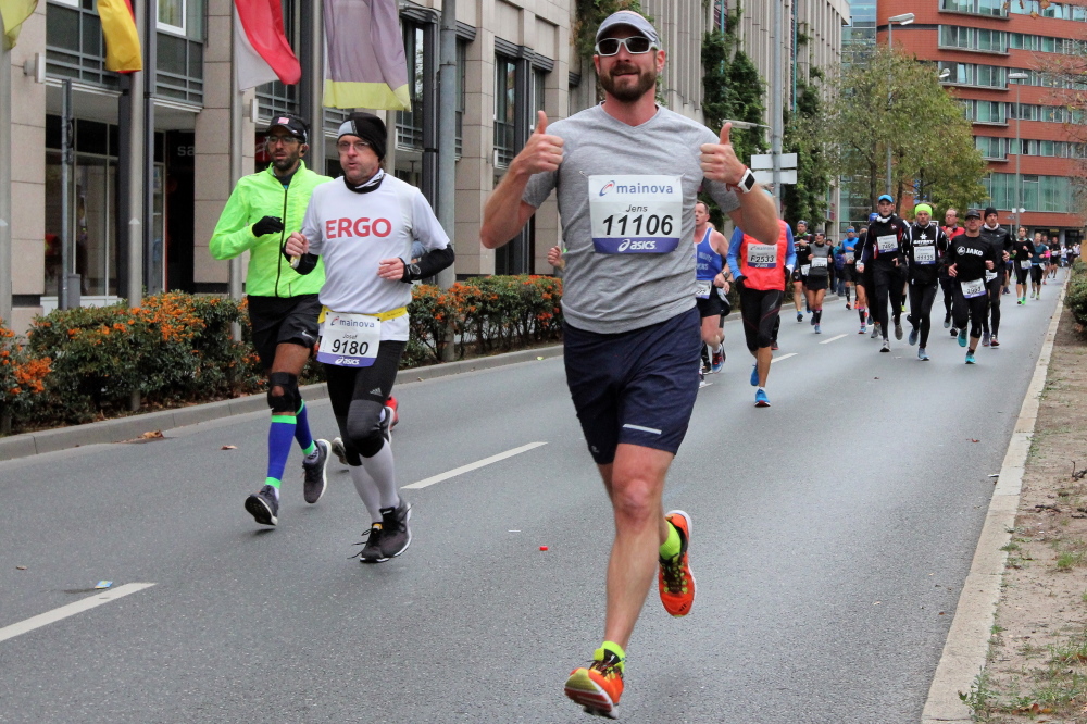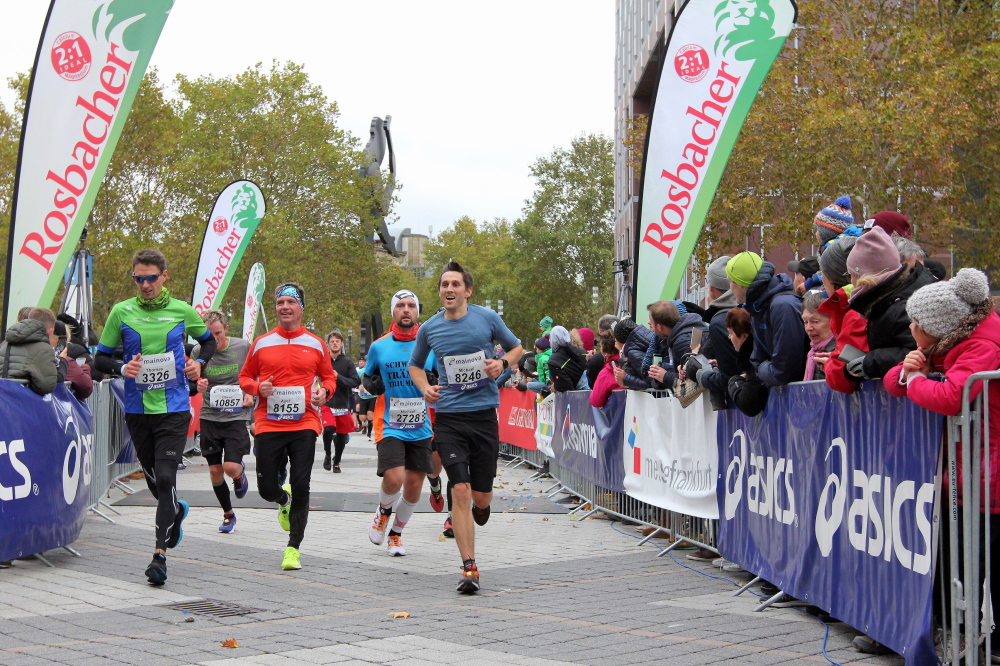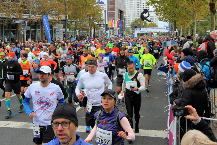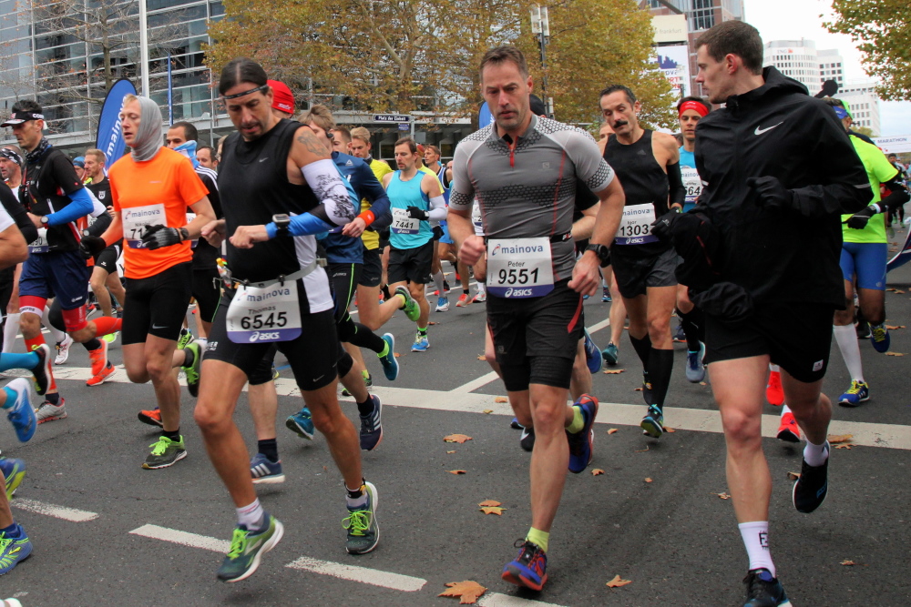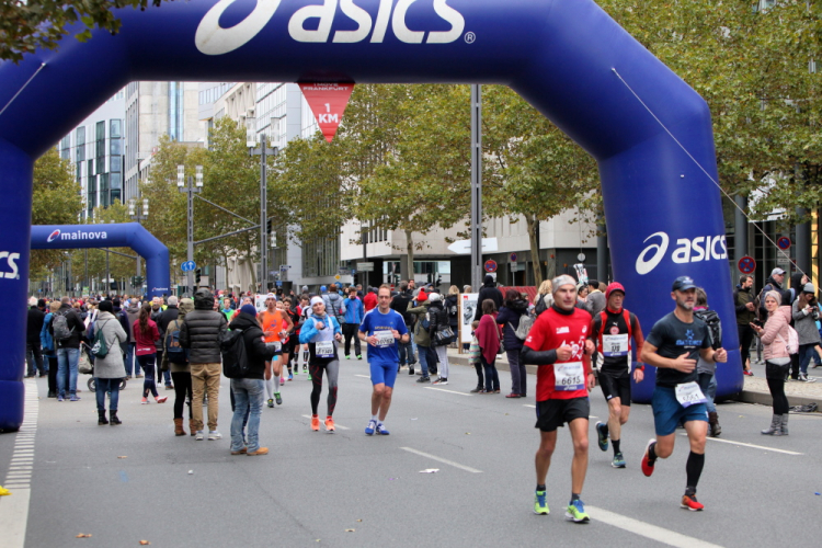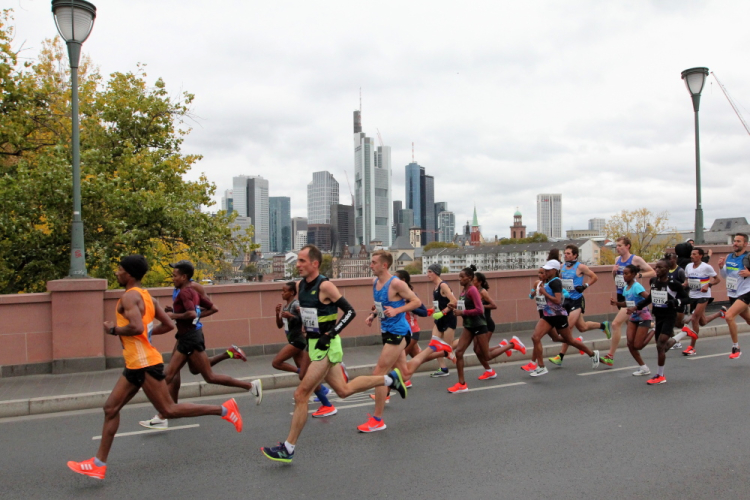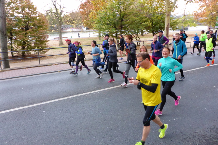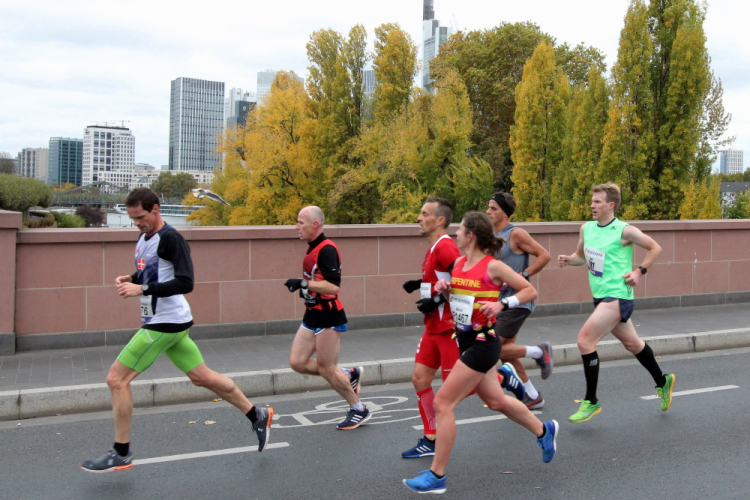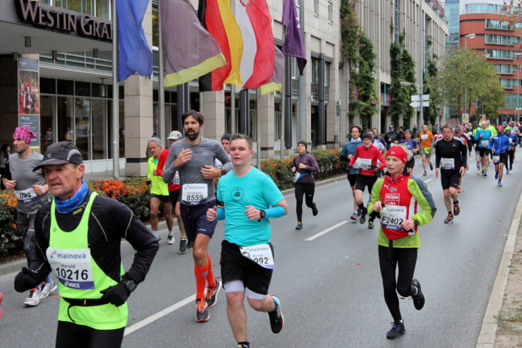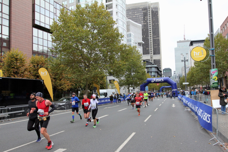 Auf der anderen Seite der Senckenberganlage kommen die Spitzenläufer schon entgegen. 3,5 Kilometer in 11 Minuten? Das will ich auch! Als ich nach der Runde durch die Innenstadt dort ankomme, sind die gegenüberliegenden Startblöcke leer und sämtliche Zuschauer jetzt auf dieser Seite. Ich habe reichlich Körner, fühle mich gut.
