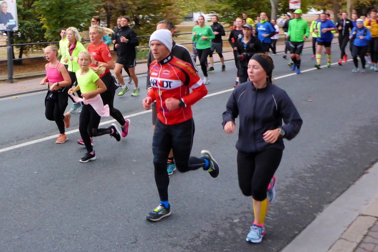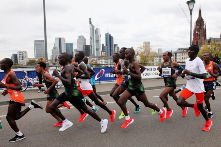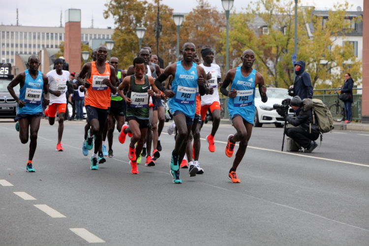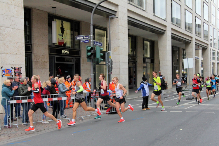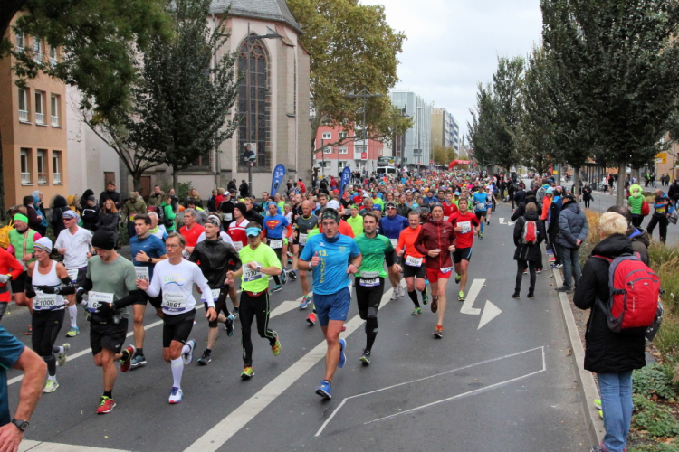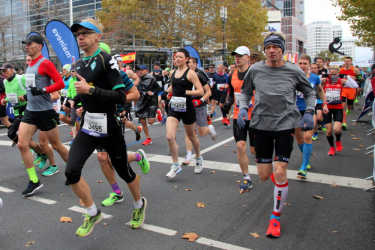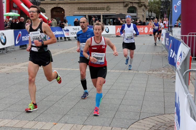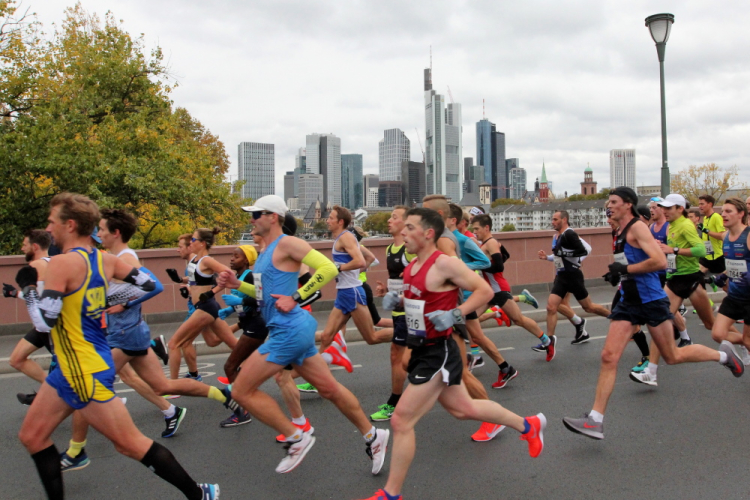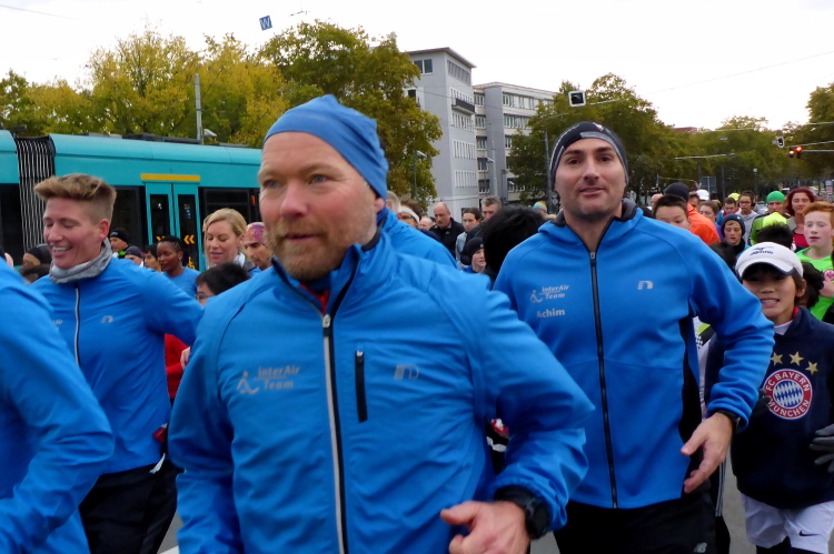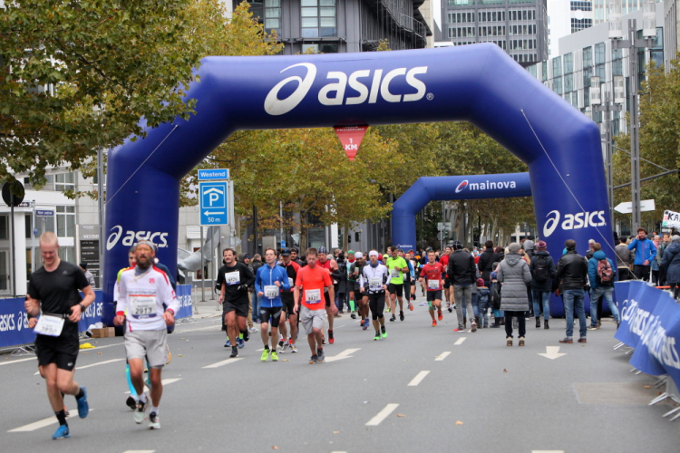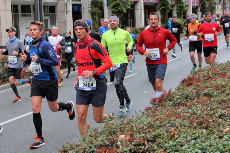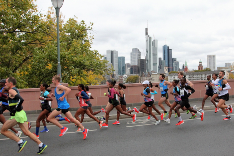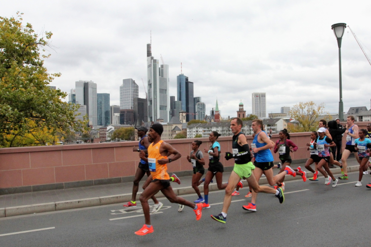 Auf der anderen Seite der Senckenberganlage kommen die Spitzenläufer schon entgegen. 3,5 Kilometer in 11 Minuten? Das will ich auch! Als ich nach der Runde durch die Innenstadt dort ankomme, sind die gegenüberliegenden Startblöcke leer und sämtliche Zuschauer jetzt auf dieser Seite. Ich habe reichlich Körner, fühle mich gut.