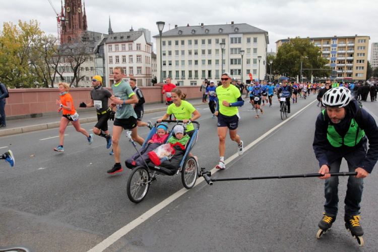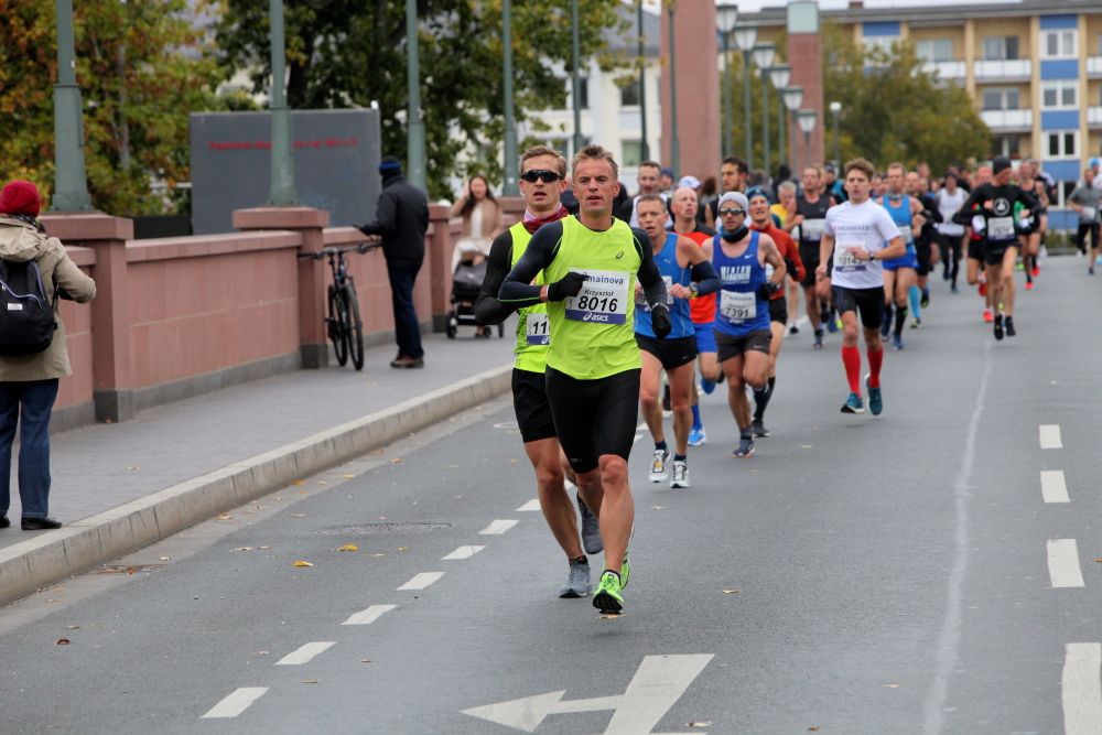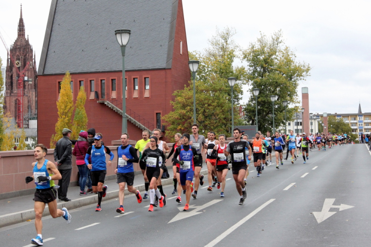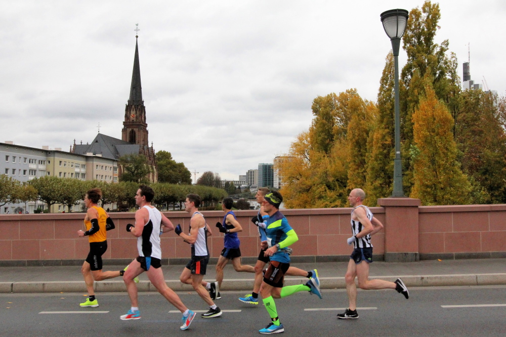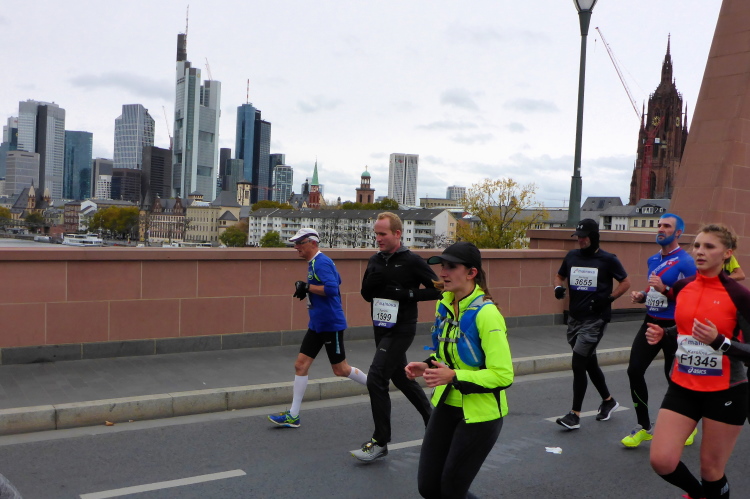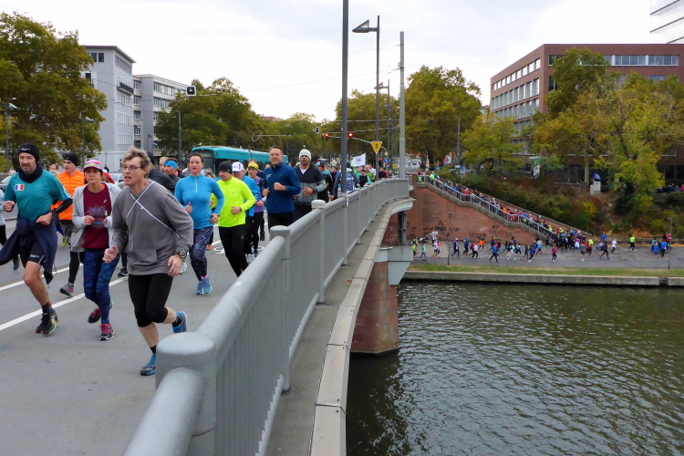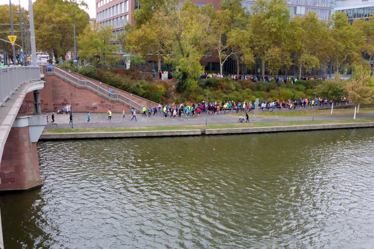Leichter Anstieg zur Alten Brücke, von der die meisten Fotos beim Frankfurt Marathon geschossen werden, weil die Läufer nun perfekt vor die Skyline passen. Die Brücke verbindet die beiden Ufer mit der Maininsel. Hier ist die Furt der Franken, die der Stadt den Namen gab, zu verorten. Auf der Insel war eine Richtstätte der Stadt. Die Köpfe der zum Tode Verurteilten wurden zur Abschreckung auf die hölzernen Brückenpfosten gespießt. 100 bis 150 Jahre hielt sich so ein Kopf auf den Pfosten, bis er abfiel. Bei der heutigen Volksbefragung habe ich für die Abschaffung der Todesstrafe in Hessen gestimmt.