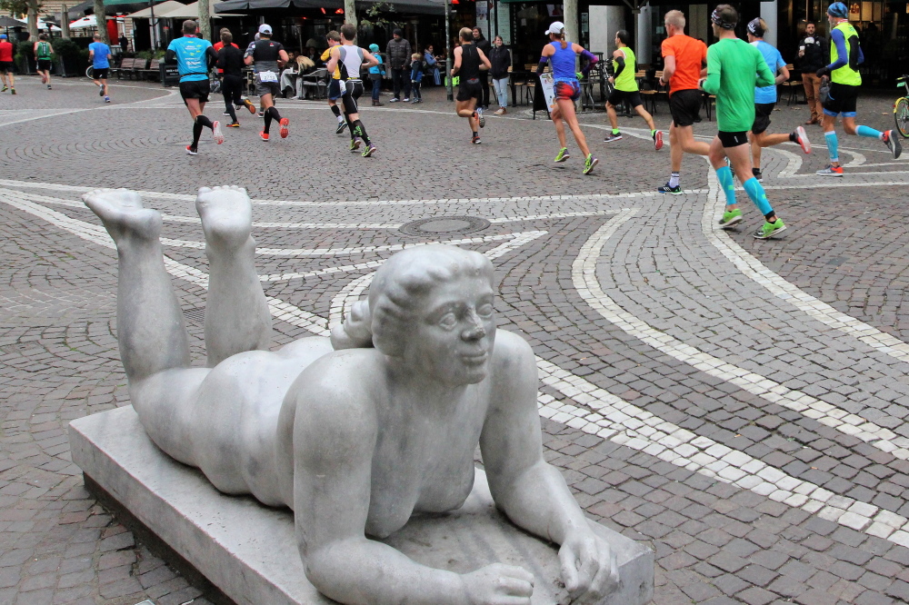 Als ich mein Fahrrad am Hermes Denkmal anschließe, werde ich von schwarz gekleideten Männern kontrolliert. Entweder ich sehe nicht aus wie ein Läufer, oder man fragt sich, was ich in meinem Rucksack auf die Strecke mitnehme. Als einer reinschaut erkläre ich ihm, dass eine Maschine nicht mit Wasser läuft.