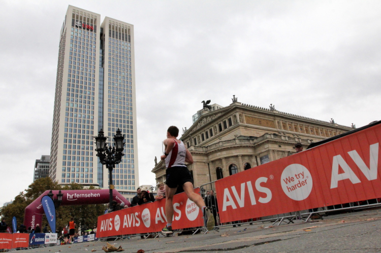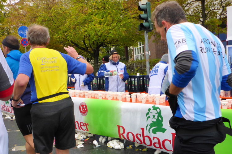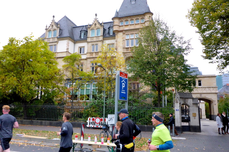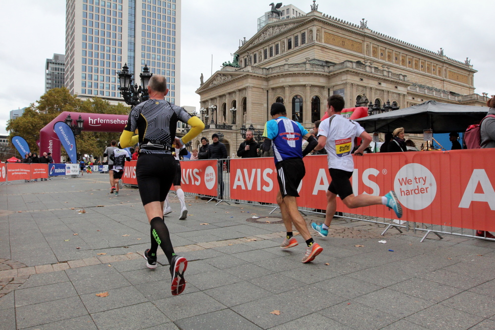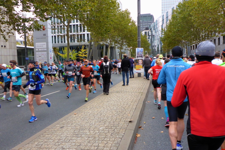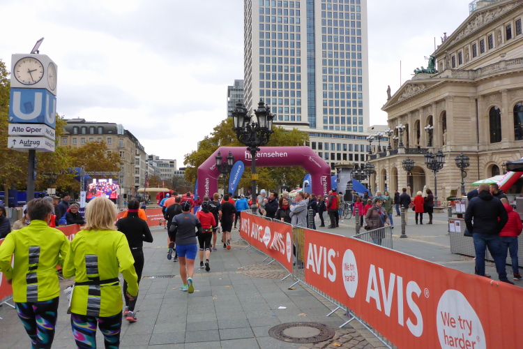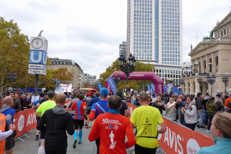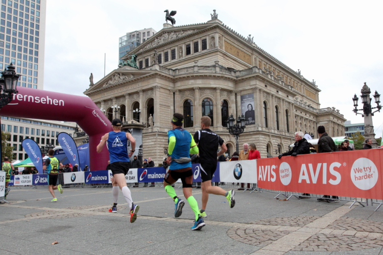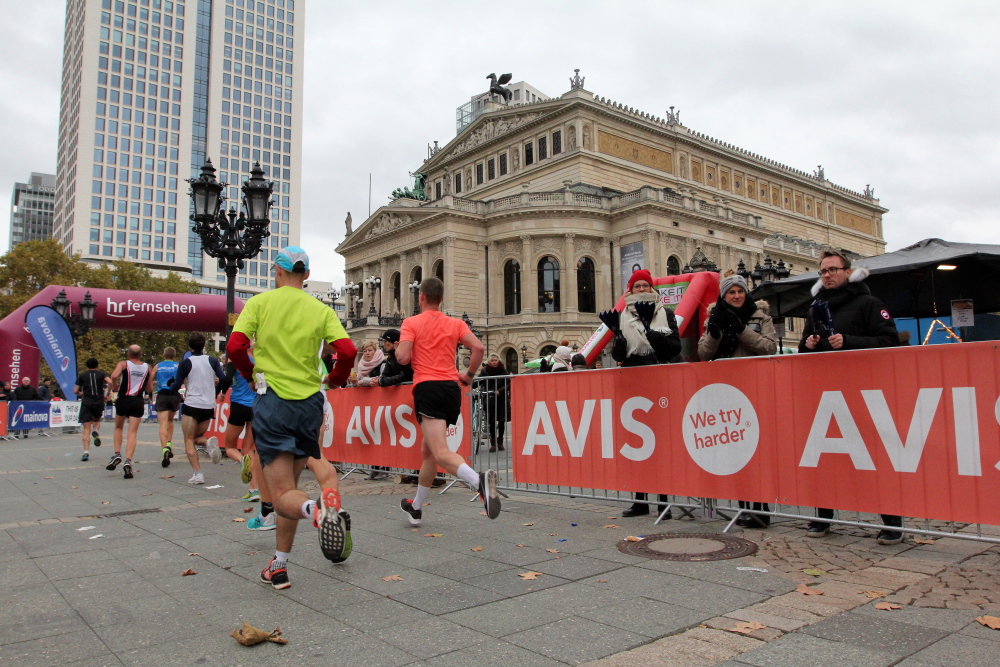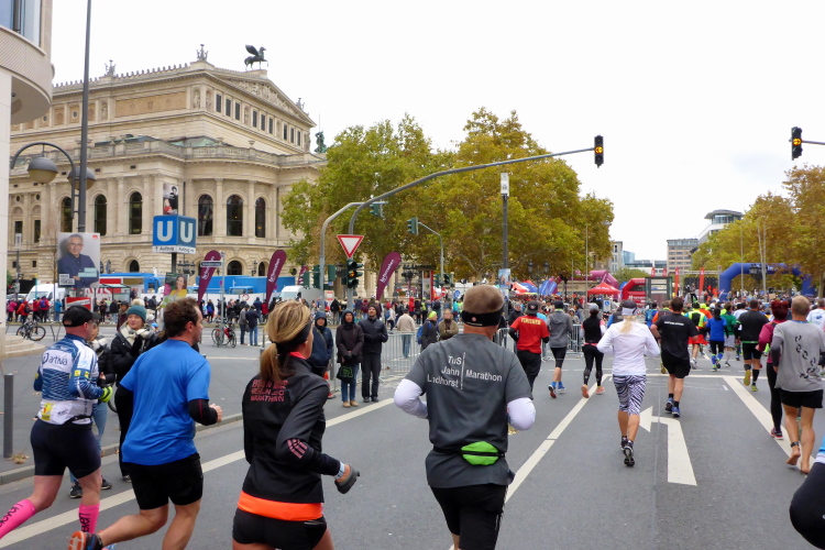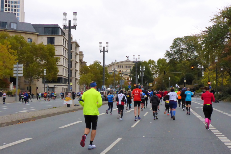 Auf der Bockenheimer Landstraße wurden die Wasserbecher heute Morgen in Etagen beidseitig der Laufstrecke gestapelt, jetzt müssen die Helfer reichlich nachschenken. Wir kommen zum ersten Mal an der Alten Oper vorbei. Als 1880 Wilhelm I. die Alte Oper eröffnete, seufzte er: „So etwas könnte ich mir in Berlin nicht leisten!“ Ich leiste mir einen schnellen Lauf, Probleme mit dem kalten Wind haben nur die Afrikaner im Spitzenfeld.