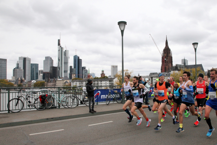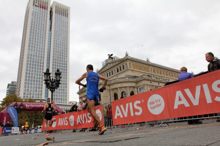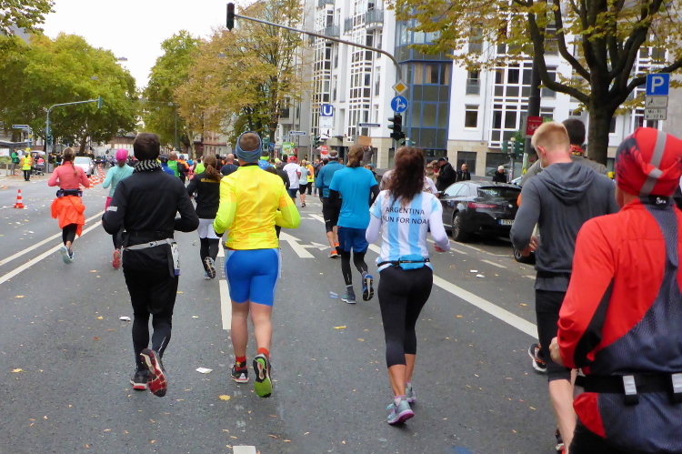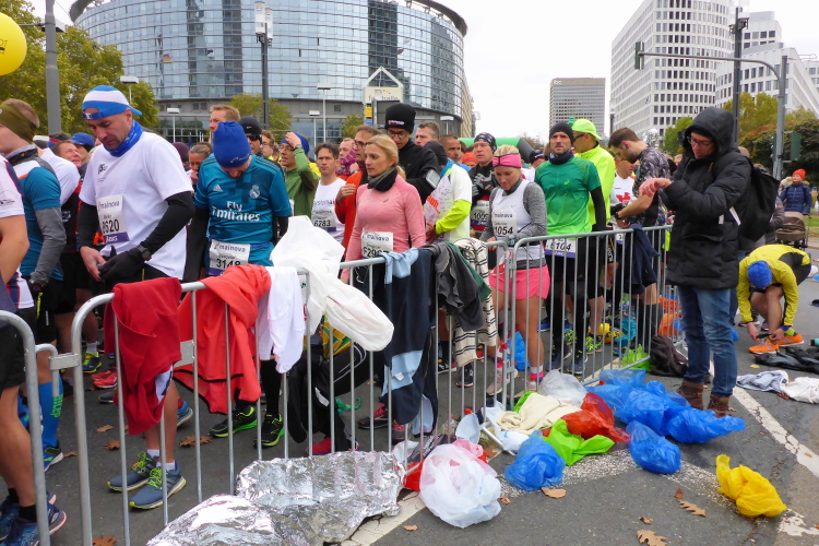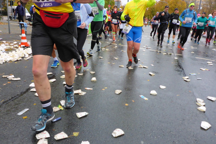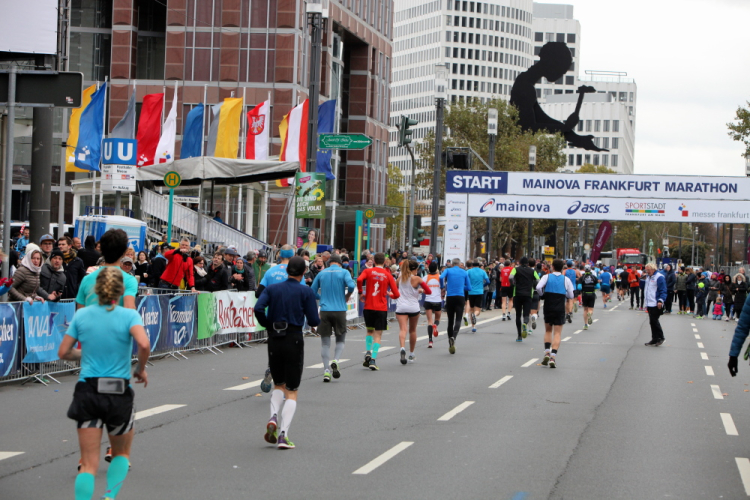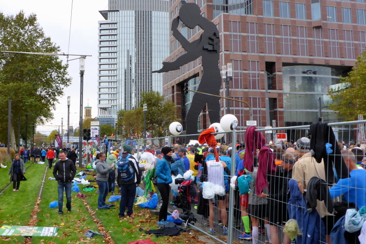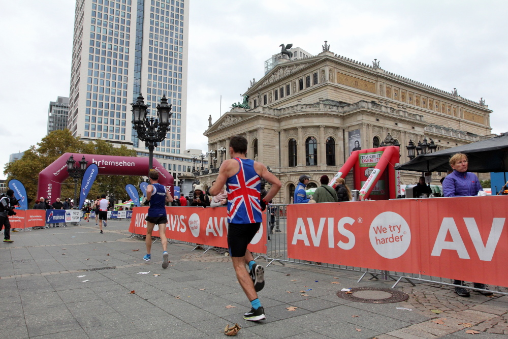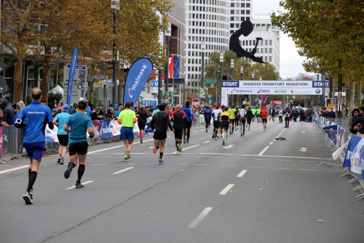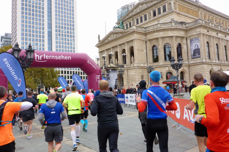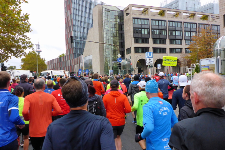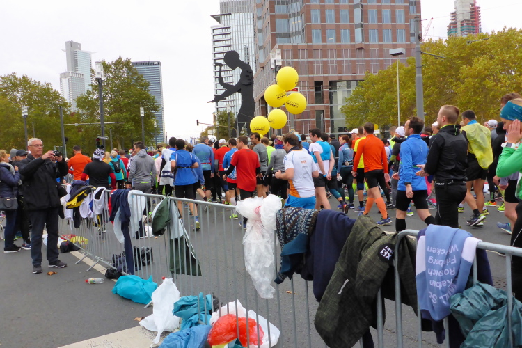 Auf der Bockenheimer Landstraße wurden die Wasserbecher heute Morgen in Etagen beidseitig der Laufstrecke gestapelt, jetzt müssen die Helfer reichlich nachschenken. Wir kommen zum ersten Mal an der Alten Oper vorbei. Als 1880 Wilhelm I. die Alte Oper eröffnete, seufzte er: „So etwas könnte ich mir in Berlin nicht leisten!“ Ich leiste mir einen schnellen Lauf, Probleme mit dem kalten Wind haben nur die Afrikaner im Spitzenfeld.