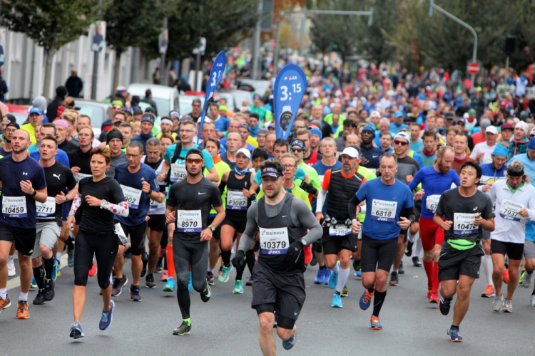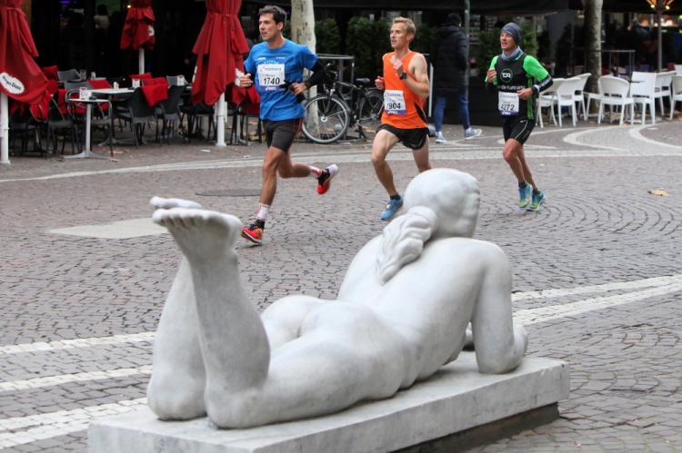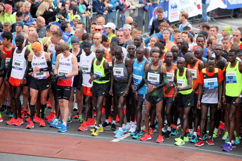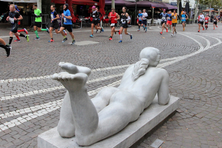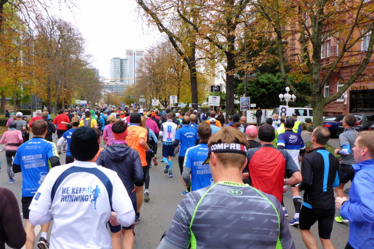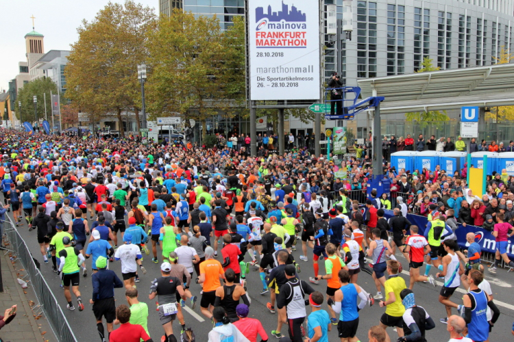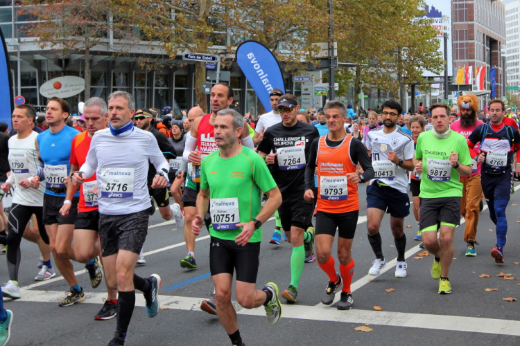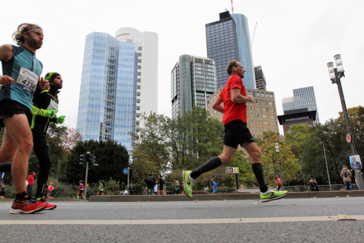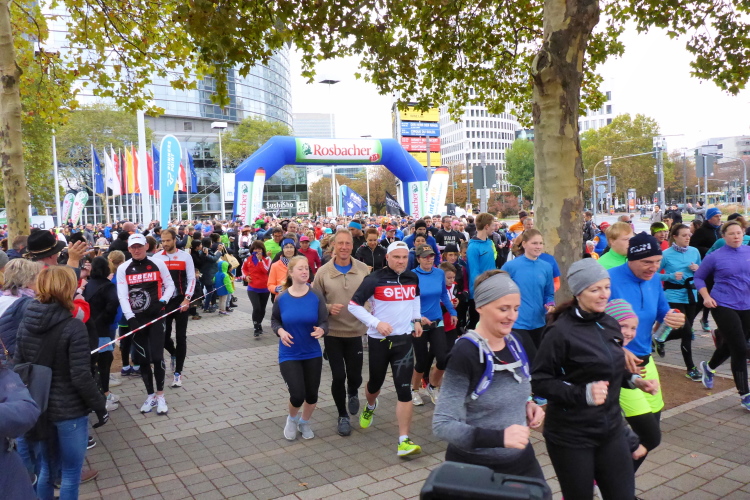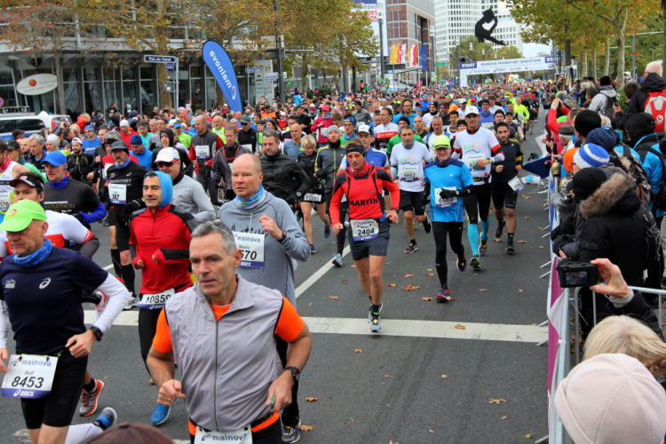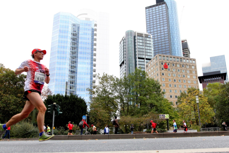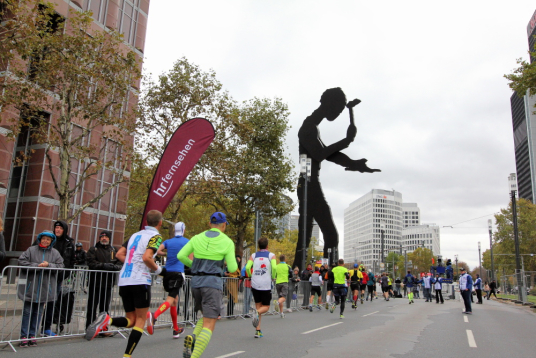 Auf der Bockenheimer Landstraße wurden die Wasserbecher heute Morgen in Etagen beidseitig der Laufstrecke gestapelt, jetzt müssen die Helfer reichlich nachschenken. Wir kommen zum ersten Mal an der Alten Oper vorbei. Als 1880 Wilhelm I. die Alte Oper eröffnete, seufzte er: „So etwas könnte ich mir in Berlin nicht leisten!“ Ich leiste mir einen schnellen Lauf, Probleme mit dem kalten Wind haben nur die Afrikaner im Spitzenfeld.