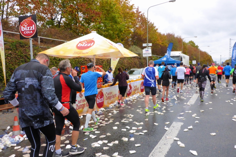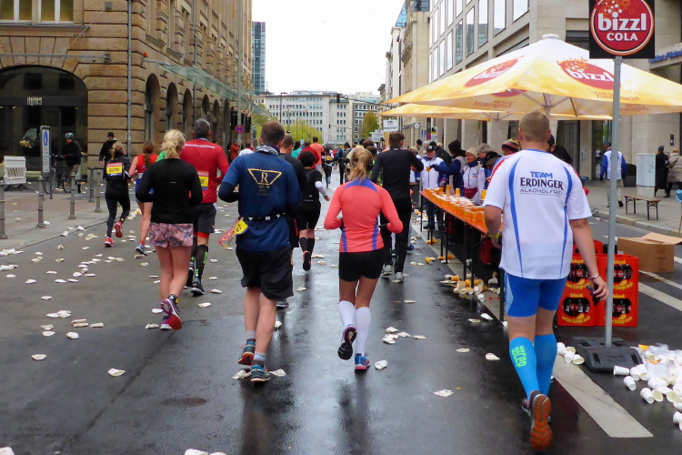 An der Börse gibt es die letzte Verpflegungsstation. Die Limofirma bizzl wurde 1968 gegründet, als ein späterer Außenminister seinen Professor auf der Bockenheimer Landstraße mit Torten bewarf. Die Limo ist gut, dennoch wir viel auf das Kopfsteinpflaster der Freßgass verschüttet, so dass man von sicherem Lauf nicht sprechen kann. Es gibt Geräusche, als würde man mit einem Pömpel den Abfluss bearbeiten.