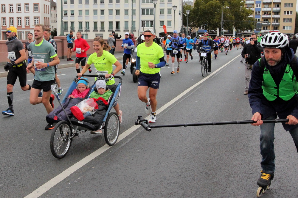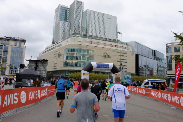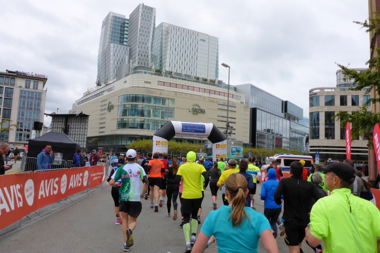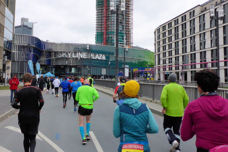 Mit Kilometer 35 kommen wir nahe zur Festhalle, man kann vom Europaviertel aus die verschwitzte Luft im Zielbereich schon fast riechen. Letzten Monat wurde Richtfest für Deutschlands höchsten Wohnturm gefeiert. Die 401 Appartements des Grand Towers sind für bis zu 40.000 Euro pro Quadratmeter verkauft worden. Vor dem Mövenpick ist das Führungsfahrzeug geparkt. Bei 2:06.37 eist die Uhr stehengeblieben. Wer damit nichts anfangen kann, hier eine andere Zahl: Arne Haase (86), er ist auch in diesem Jahr ältester Teilnehmer auf der Volldistanz, läuft nach 6:09 Stunden ins Ziel. Das würden 95 % der Bundesbürger nicht schaffen.