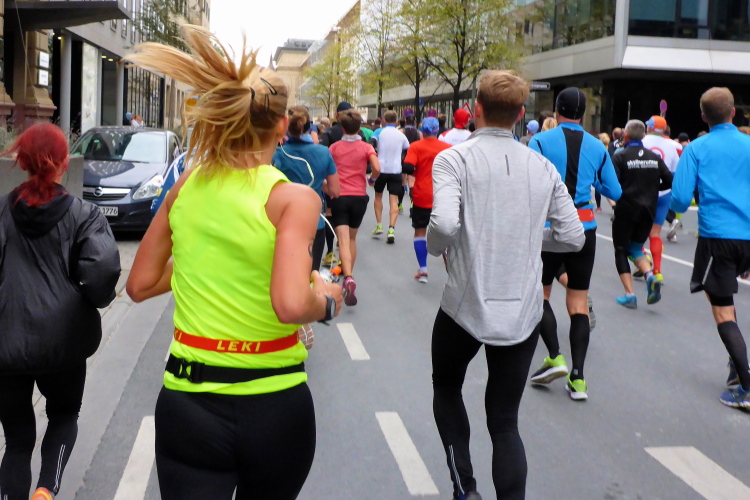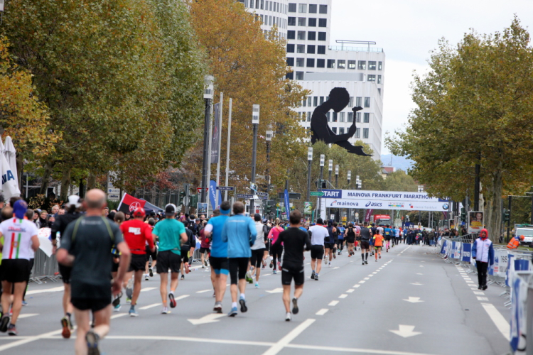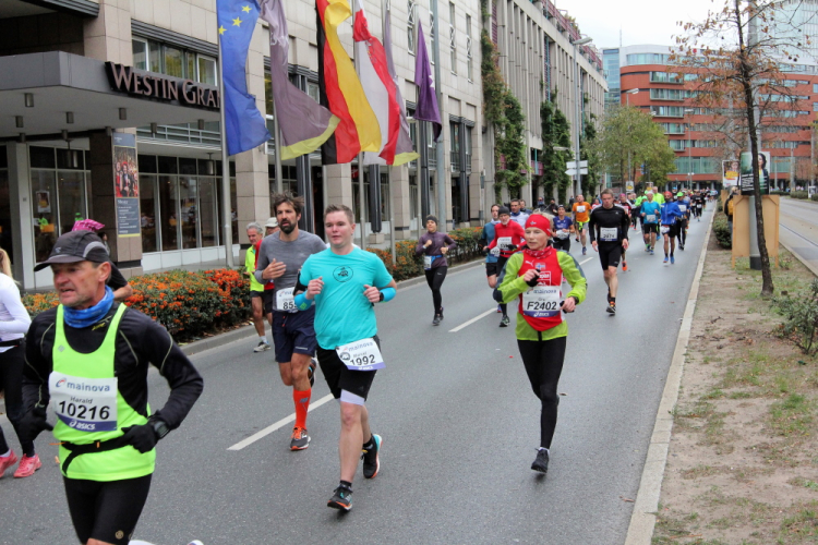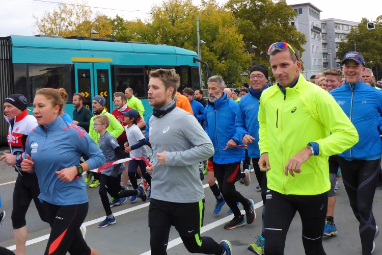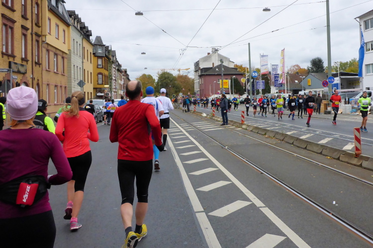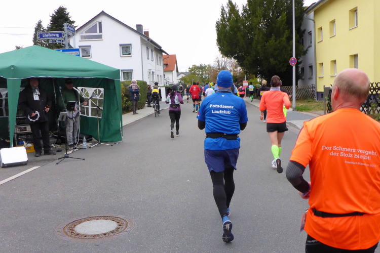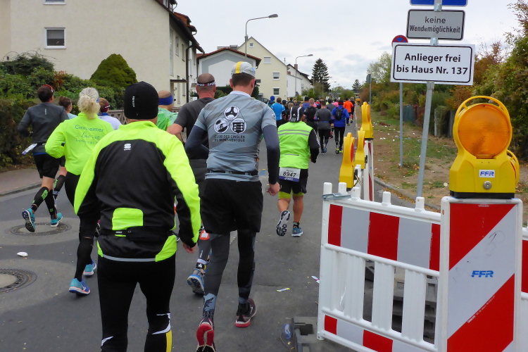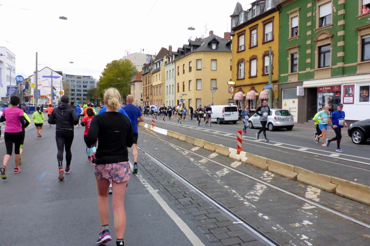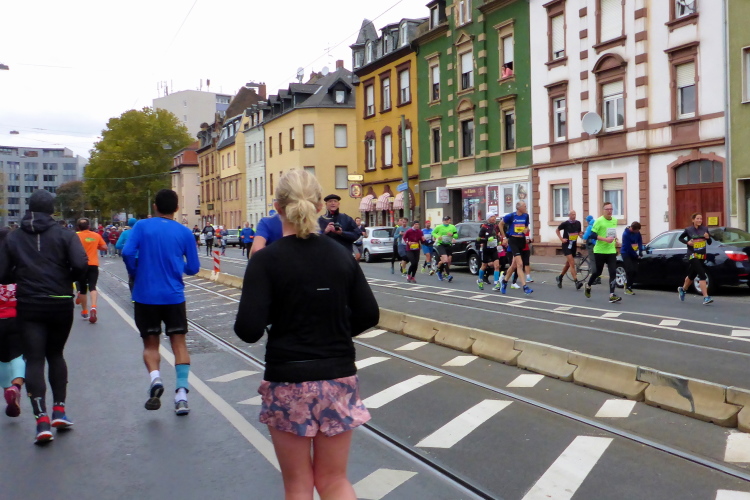 Und endlich kommt die gefürchtete Mainzer Landstraße. Vor hundert Jahren breitete sich über diese Straße die spanische Grippe aus. Grund war die Straßenbahnlinie 15, mit der die Erkrankten zum städtischen Krankenhaus fuhren, weil Krankenwagen für Sterbenden reserviert waren. Jetzt nutzen die Staffelläufer die Straßenbahn und erste Läufer haben Anfälle, legen sich an den Straßenrand oder hängen über dem Zaun, der uns von den Gleisen trennt. Ich will nicht lügen, aber gut versorgte, leidende Läufer zu sehen macht mich schneller.