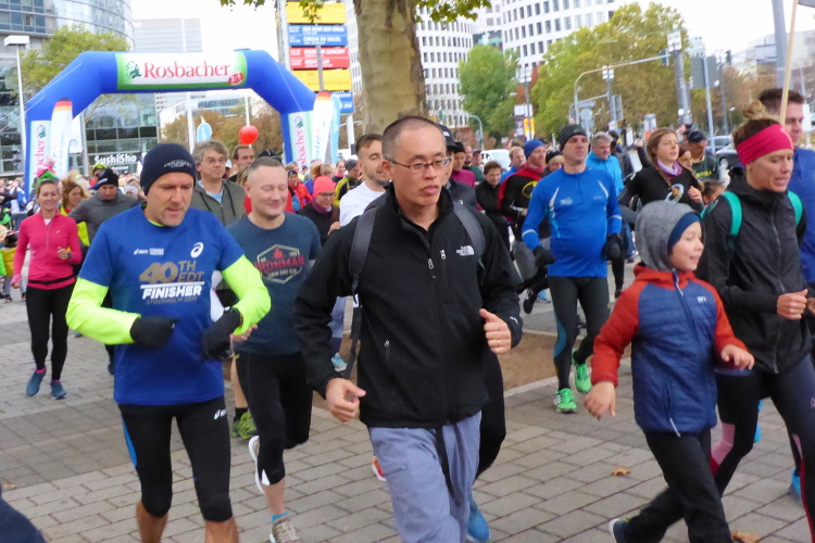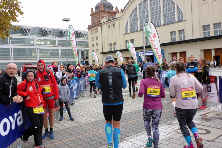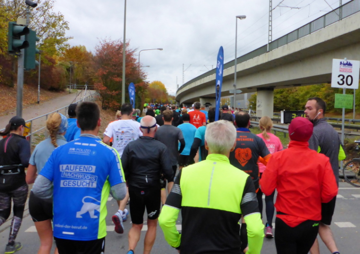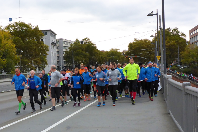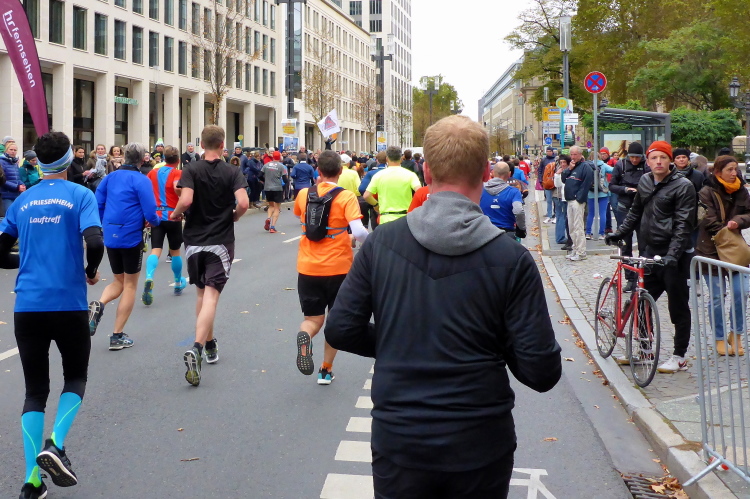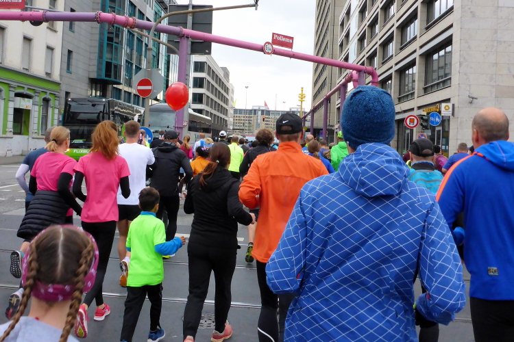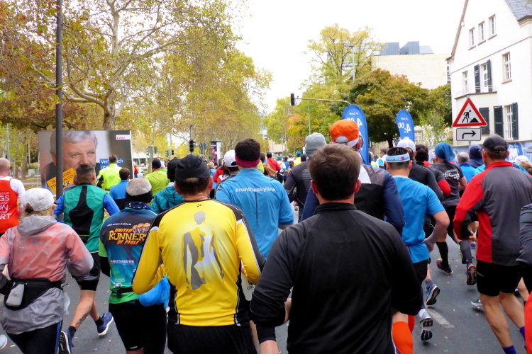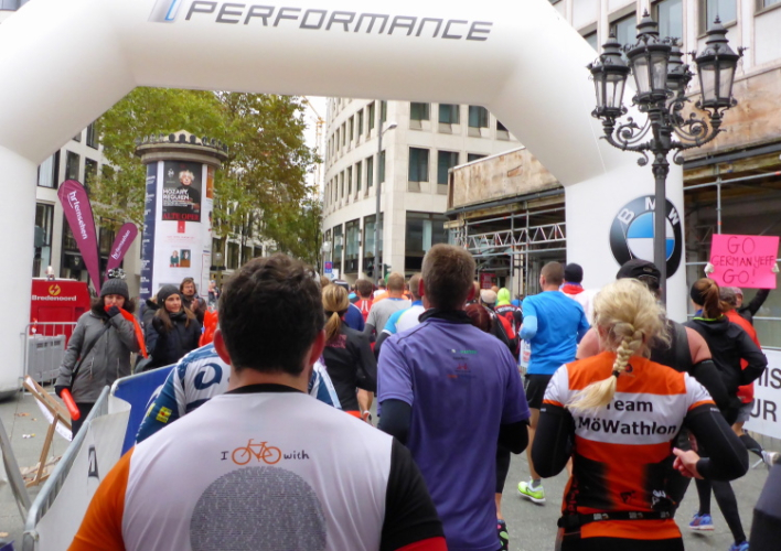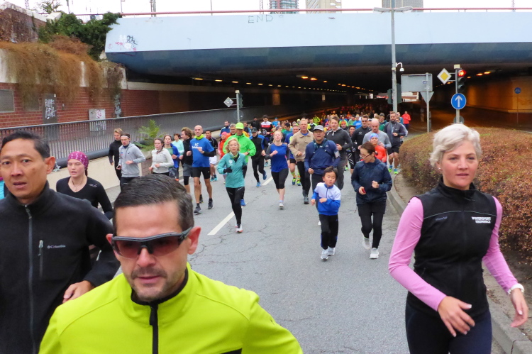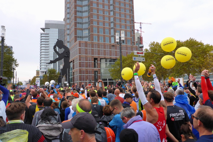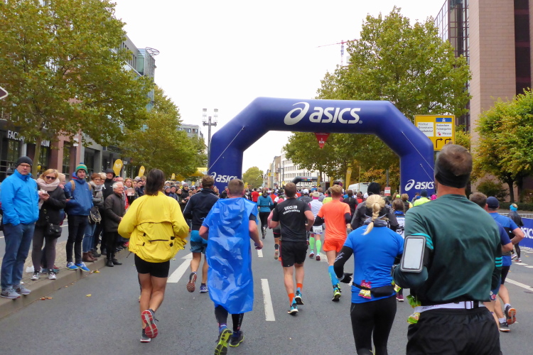 Die hohen Absperrgitter sind durchlässiger aufgebaut als sonst. Kontrollen, ob man sich in den richtigen Block einordnet, gibt es offenbar nicht. Das Gefühl zum Schlachthof getrieben zu werden kommt somit nicht auf. Als die hinteren Startblöcke um 10:10 Uhr gestartet werden, reihe ich mich ein. Das übliche Auflaufen auf die Vorderläufer bleibt aus, um 10:11 Uhr beginnt mein Rennen. Früher nervten noch unerfahrene Staffelläufer, indem sie durch unkontrollierte Überholmanöver Unruhe ins Feld brachten. Das gibt es nicht mehr, Staffelläufer starten später.