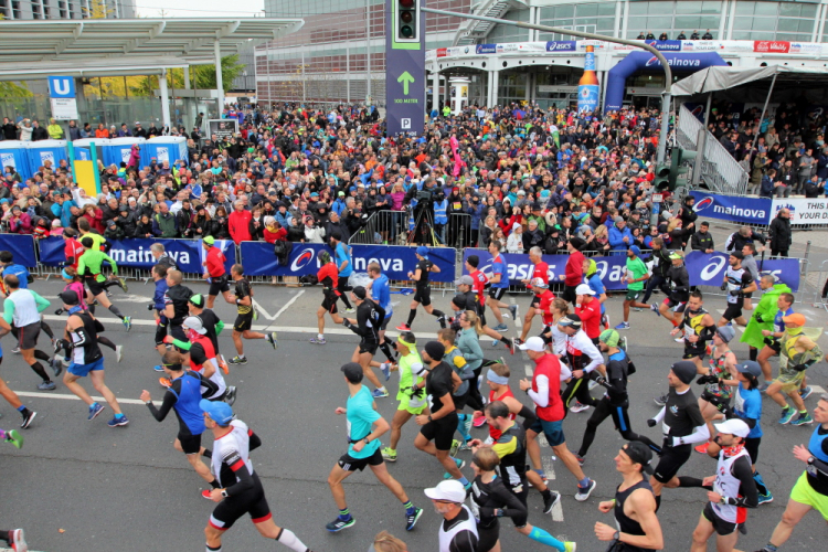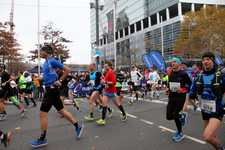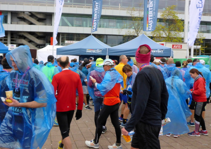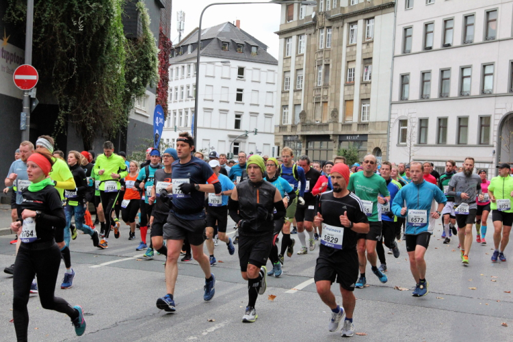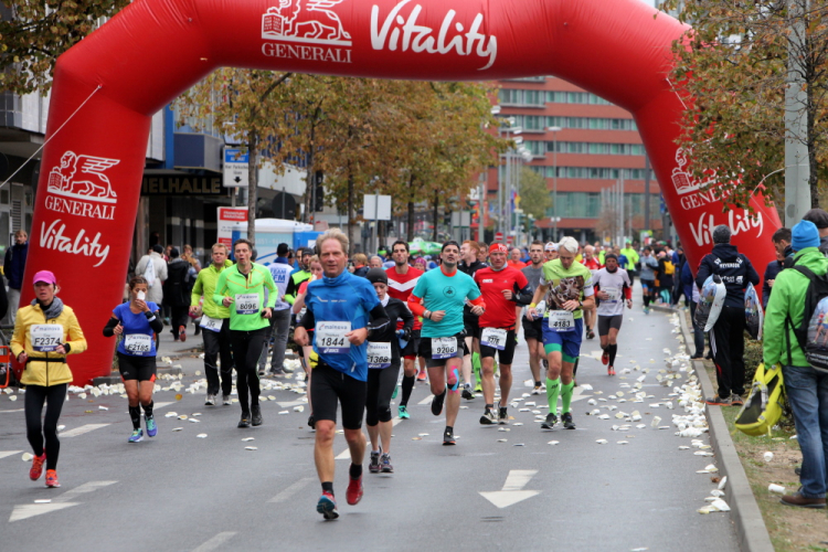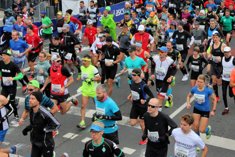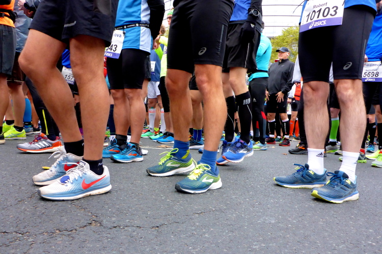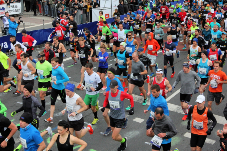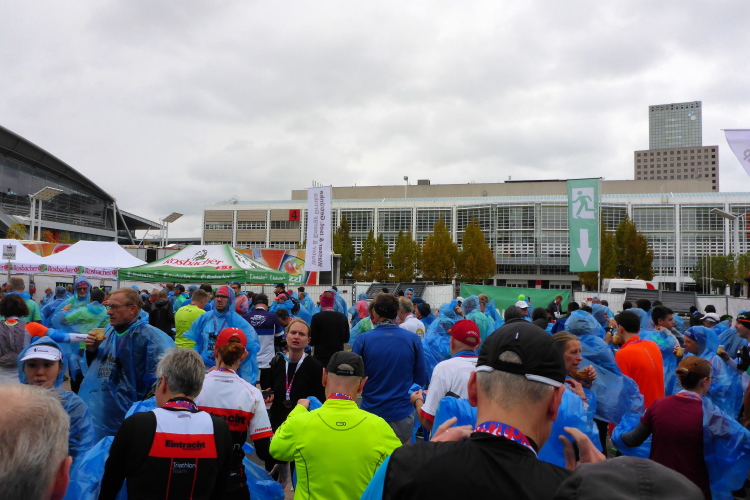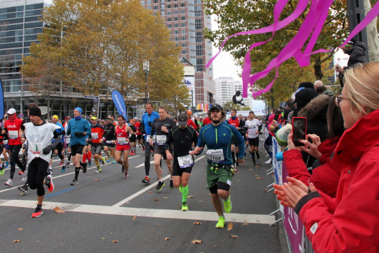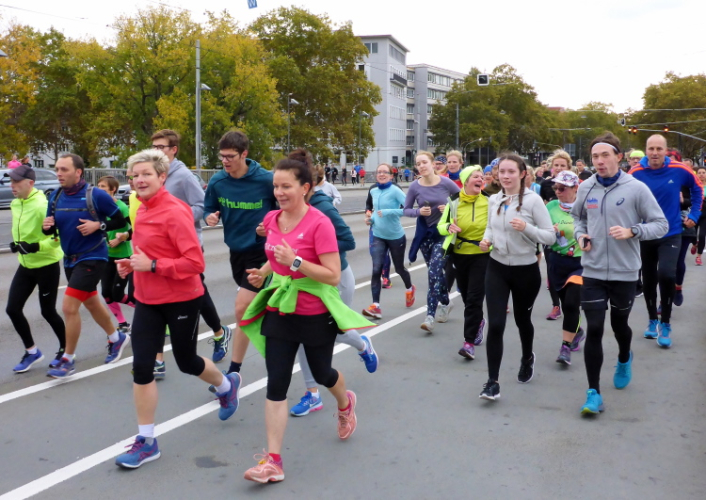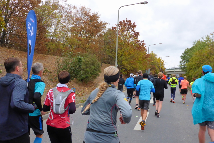 Die hohen Absperrgitter sind durchlässiger aufgebaut als sonst. Kontrollen, ob man sich in den richtigen Block einordnet, gibt es offenbar nicht. Das Gefühl zum Schlachthof getrieben zu werden kommt somit nicht auf. Als die hinteren Startblöcke um 10:10 Uhr gestartet werden, reihe ich mich ein. Das übliche Auflaufen auf die Vorderläufer bleibt aus, um 10:11 Uhr beginnt mein Rennen. Früher nervten noch unerfahrene Staffelläufer, indem sie durch unkontrollierte Überholmanöver Unruhe ins Feld brachten. Das gibt es nicht mehr, Staffelläufer starten später.