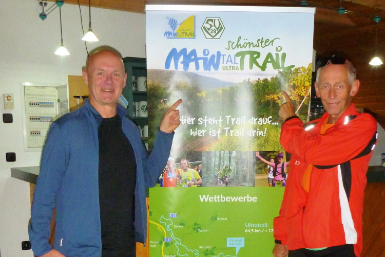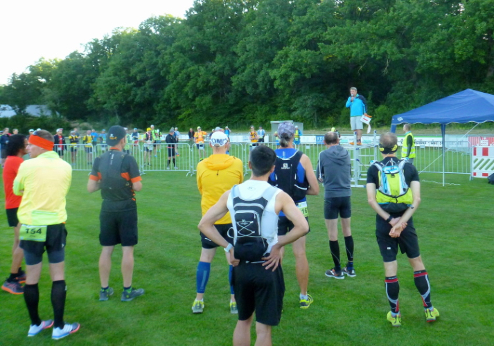 Gegen 06.15 Uhr stehe ich dann auf dem Sportplatz, wo noch die letzten Arbeiten im Gange sind. Wir erhalten gegen eine kleine Spende Kaffee und ein Hörnchen. In einer Garage kann die Bekleidung abgegeben werden, diese wird auch bewacht. Wer mag, hätte auch auf dem Sportplatz campen können, Einige Trailläufer haben in ihren Autos oder Kombis übernachtet. Ich bin gerade mit meinem Frühstück fertig, da bittet Thomas zum Briefing. Wir erhalten Informationen zur Ausschilderung und zu den Besonderheiten der Strecke, sowie noch weitere nützliche Tipps. Ja, der Thomas kennt die Strecke wie aus dem Effeff, denn er wohnt in Güntersleben und ist auch Läufer.