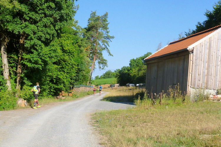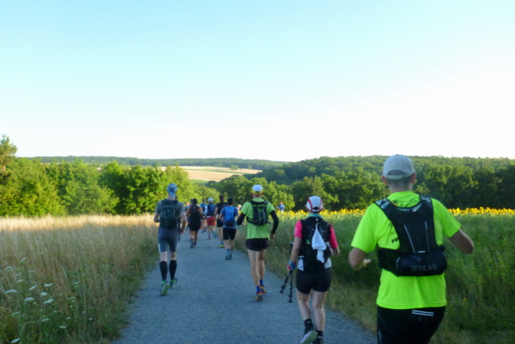 Nach einem Waldkilometer auf breiten „kommoden“ Wegen führt uns die Strecke nur kurz über Felder, die kurz vor der Getreideernte stehen, das Korn ist schon fast überreif. Rechts sehe ich ein Feld mit fast mannshohen Sonnenblumen. Ein tolles Motiv, die Blumen, dazwischen fotografierende Läufer und die strahlende Sonne, die jetzt erst knapp über dem Firmament steht, entsprechend blendet und dennoch eine bezaubernde Morgenstimmung entfaltet.
