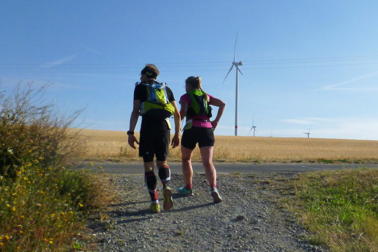 Nördlich des Lerchenberges beträgt der Restweg nur noch 25 Kilometer, eine Frau in Trailkleidung, aber ohne Startnummer treibt mich den Berg hinauf. Sie wartet auf einen Teilnehmer. Ich werde sie später noch öfter sehen.