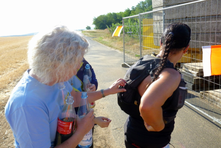 Dann überqueren wir die Ortsverbindungsstraße Thüngersheim – Güntersleben, die Sicherung haben zwei Helfer übernommen, dennoch sind wir gefordert, auf den fließenden Verkehr zu achten. Die erste Tankstelle kommt nach etwa zehn Kilometer, im Angebot sind Wasser, Cola, Apfelschorle und feste Nahrung wie Obst, Salziges und Kartoffeln. Ganz wichtig, nehmt immer Salz zu euch, denn gerade bei hohen Temperaturen, die heute vorhergesagt sind, verliert der Körper NaCl.
