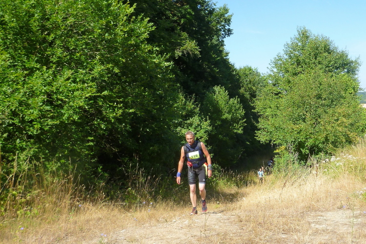 Es geht wieder ein längeres Stück bergan und ich höre bei einem Pärchen „atmosphärische Störungen“. Ich denke, dass da jemand gerade eine Krise durchmachen muss. Er nörgelt ein wenig herum. Nun, durch überstandene Krisen werden wir härter im Nehmen und jede Krise hat auch ein Ende. Meine Uhr sagt den 42. Kilometer an, die Zeit ist so lala, knapp sechs Stunden. Die nächsten Kilometer gehen eher über offenes Gelände, mittlerweile sind die Temperaturen stark gestiegen.