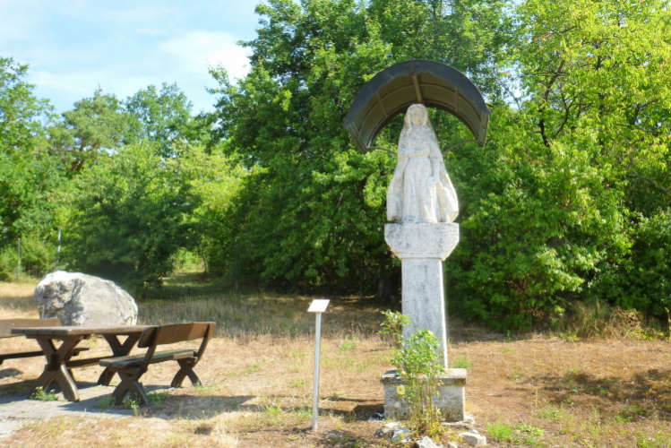 Unser Weg verlässt nun das Maintal, wir tauchen wieder in den Wald hinein und sind auf dem Fränkischen Marienweg unterwegs. Der verbindet auf einer Länge von rund 900 Kilometer 50 Wallfahrtsorte im Bistum Würzburg.