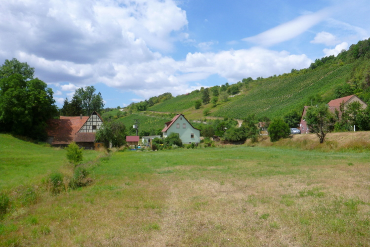 Noch 35 Kilometer sagt eine Tafel, wir nähern uns der Weinlage Stettener Stein und dem terroir f. Das sind Orte im fränkischen Weinland mit einer ganz typischen und magischen Ausstrahlung. Jeder Ort mit dieser Bezeichnung ist geprägt von der Landschaft und von besonderer Weinqualität. Ich könnte mich an Tafeln informieren oder an einem überdachten Aussichtspunkt mich inspirieren lassen. Aber dann laufen Zeit und Verfolger davon, also weiter.