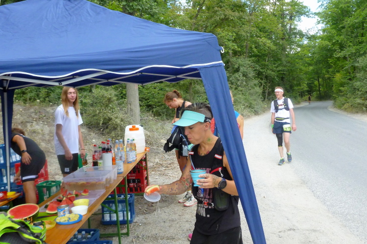 Bei Kilometer 20,7 wartet die nächste Tanke. Ich bin mit den Abständen bisher gut zu Recht gekommen, auch wenn ich nun ein leichtes Durstgefühl habe. Gleiches Prozedere: Rucksack abschnallen, heraus mit dem Becher und reichlich verpflegen. Die zwei, drei Helfer haben gut zu tun, beherrschen den Arbeitsanfall und haben sogar noch Worte des Lobes für uns übrig. Ein Mädel leert seine Schuhe aus, hat Steinchen eingesammelt. Mich ärgert auch ein Fremdobjekt im linken Schuh. Kurz bevor ich mich mit den Worten „Käse schließt den Magen“ auf den Weg mache, erscheint Michael an der Erfrischungsstelle, er könnte der Älteste im unseren Wettlauf sein, ich muss später in den Listen schauen.