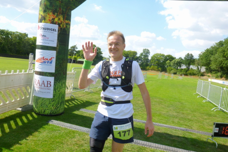 „Freue dich, dass du noch laufen kannst und geniesse die Natur“, lese ich auf einem Schild. Ja, das ist ein wahrer Spruch. Meist laufe ich nun alleine, doch bei den Verpflegungsstellen treffe ich einige Mitstreiter wie bei der Tanke 5 am Schotterwerk Schraud bei Kilometer 47,8. Über den Innenforst laufe ich nun in den Gramschatzer Wald. Wieder mehr Wald, gut für die Läufer, da mehr Schatten. Der Ochsengrund und der Binsenberg (336 Meter), ihr wisst schon, flach ist anders! Noch zehn Kilometer. Kurz danach kommt Nicole und bittet um freie Bahn auf dem Singletrail. Sie hat einen Lauf und gerne lasse ich sie vorbei. „Nutz den Schwung aus, wir sehen uns im Ziel“, kann ich nur entgegnen. Innerhalb von Minuten ist sie aus meinem Blickfeld. Gleiches Spiel bei Annika, sie geht nach vorne.