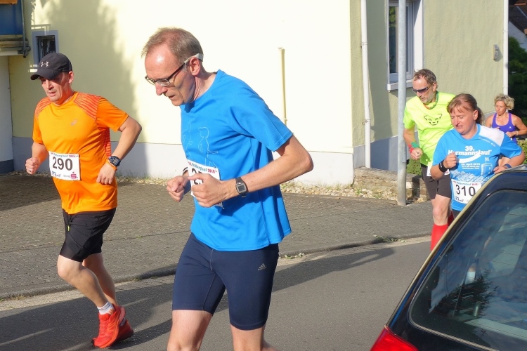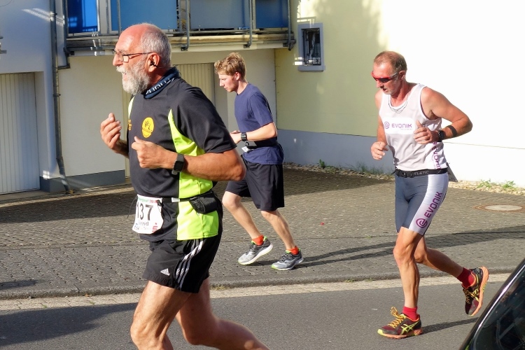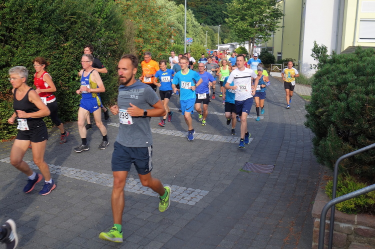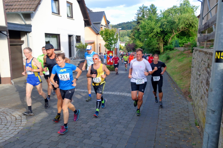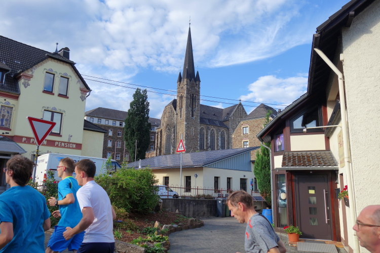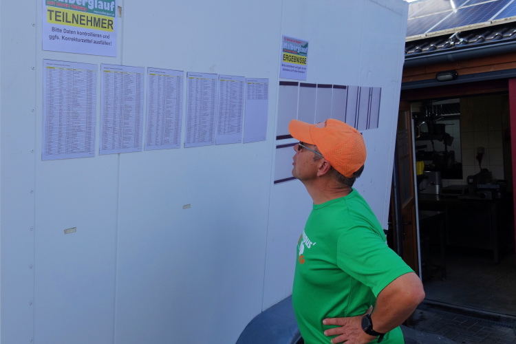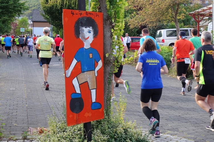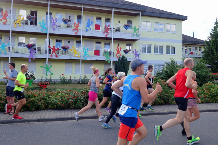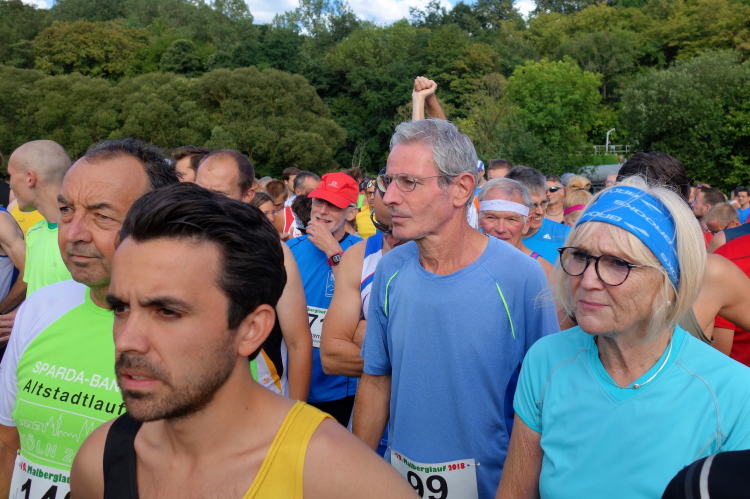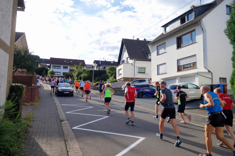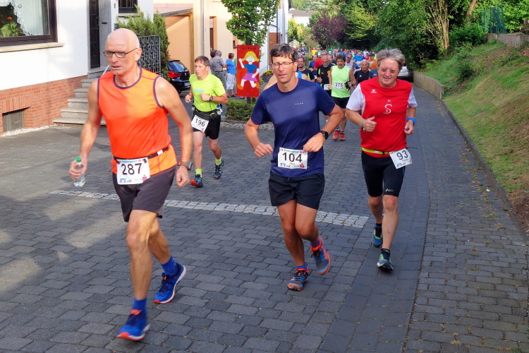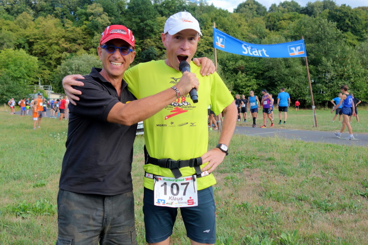 Im Tal laufen sich bereits viele Läufer warm. Auch M4Y-Kollege Karl-Heinz trabt und ich lichte ihn mitten im Ort bei einem letzten Geheimtraining ab. Ich selbst lasse es gemächlich angehen und trabe nur wenige Schritte. Ich will ja keine Bäume ausreißen und quatsche lieber mit Bekannten. Dazu gibt es reichlich Gelegenheit. Schließlich sind viele Wiederholungstäter da und man kennt sich.