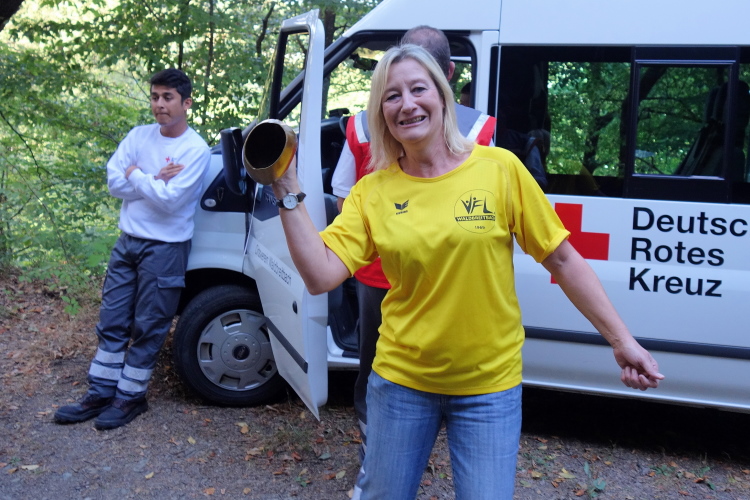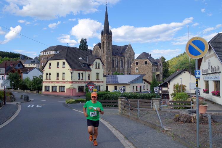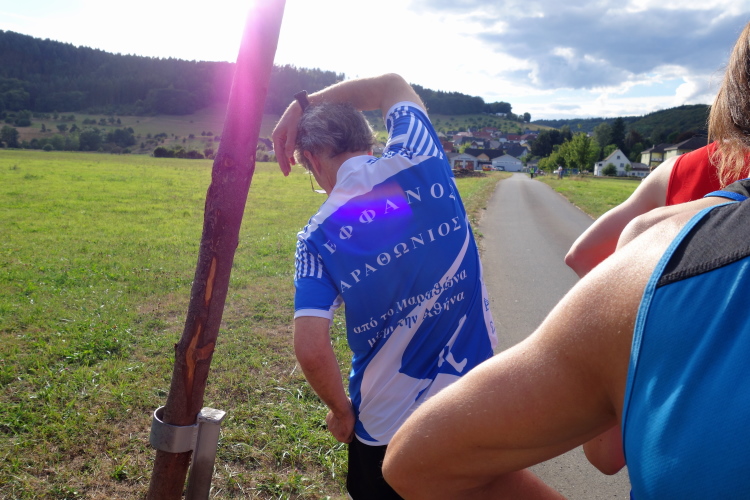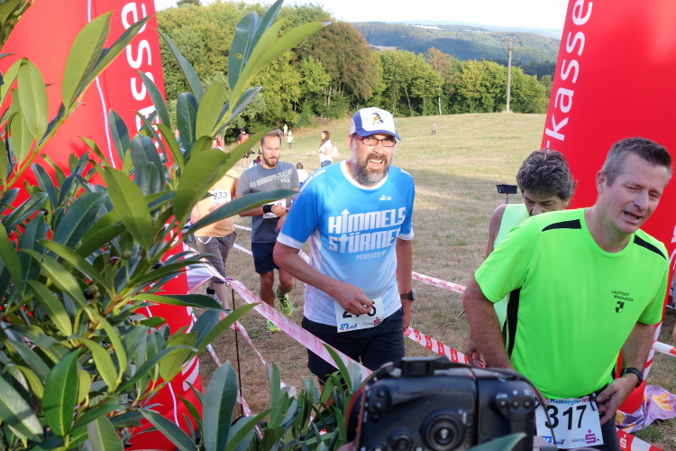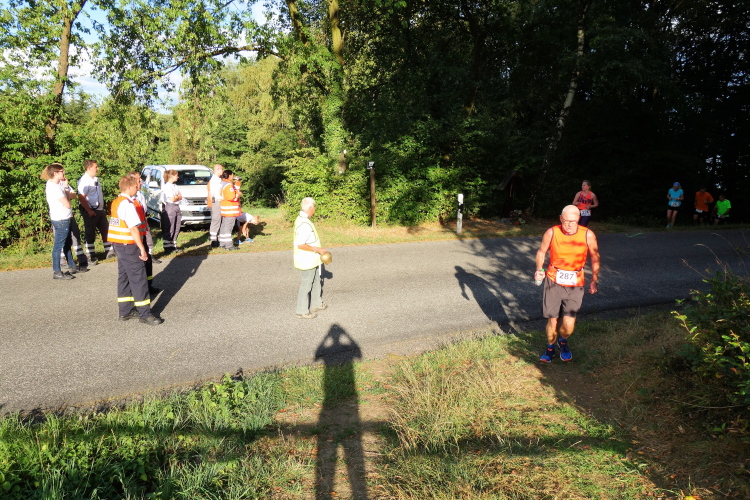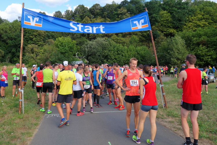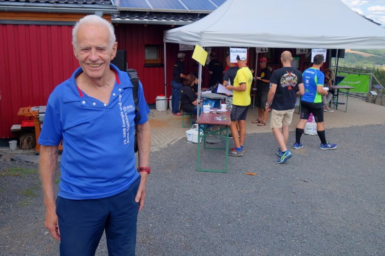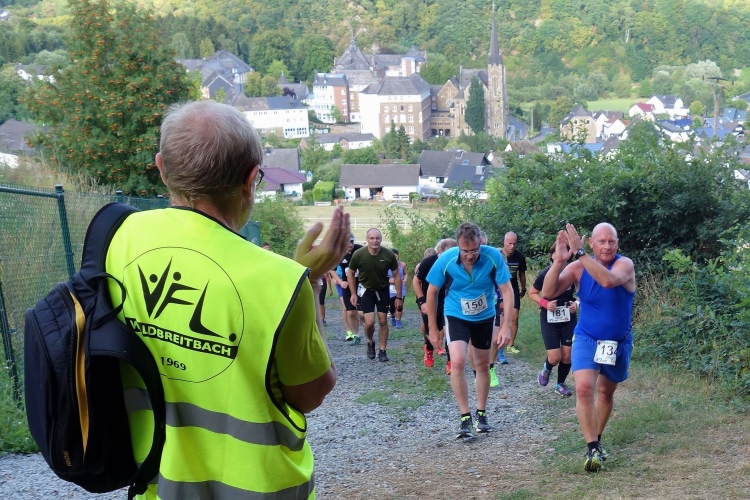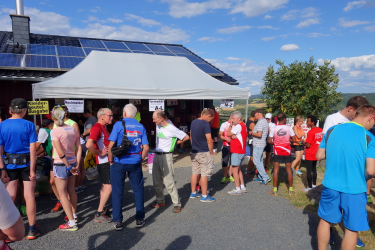 Wolfgang Bernath, Vorsitzender des ausrichtenden Vereins VFL Waldbreitbach, kommt und gibt per Megafon letzte Informationen. Vereinfacht gesagt, es geht auf und ab. Mehr rauf, aber im Wechsel. Zwei Bussarde kreisen über uns. Da sind die Geier und lauern auf kaputte Läufer, witzelt ein Läufer. Ein anderer mit griechischem Trikot macht noch letzte Dehnübungen. Bruche mer nit, sagt der Kölner dazu.