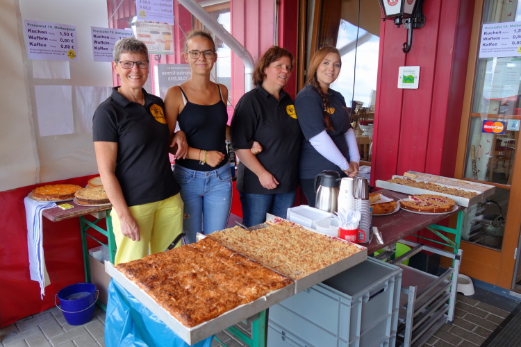 Ich gehe die wenigen Meter hinauf zum Ziel und hole meine Startunterlagen, nehme das Kuchenbuffet in Augenschein und entschließe mich direkt zum Zufassen. Die Beute wird im Auto deponiert. Da hab ich doch gleich was für nach dem Zieleinlauf. Erfahrungsgemäß sind die Vorräte schnell vergriffen. Verlorene Energien wieder aufladen ist wichtig. Und wie geht das schöner als mit Kuchen?