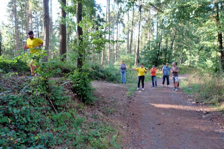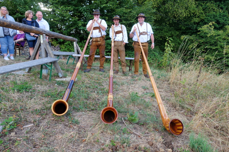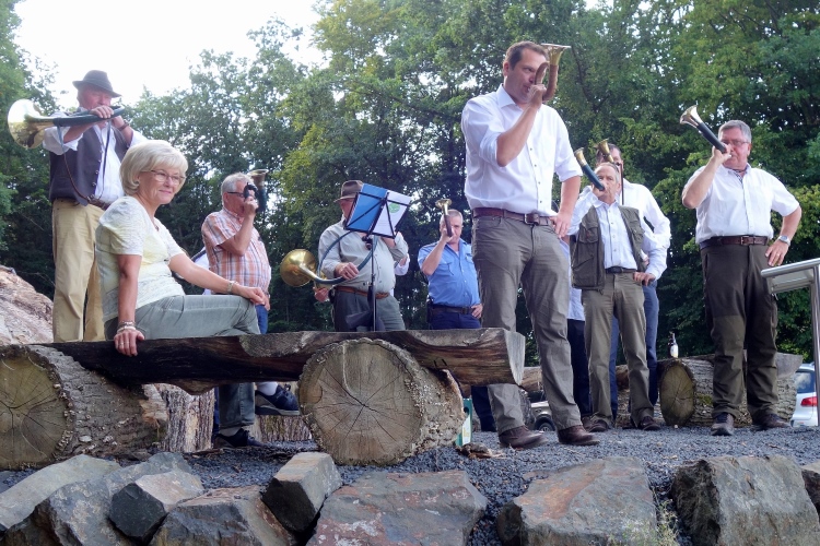 Der erste Anstieg führt uns aus dem Ort heraus. Die Straße geht über in einen Wiesenweg, besser gesagt, einen ehemaligen Wiesenweg. Dieses Jahr ist er mit grobem Basaltschotter belegt. Die alte Variante gefiel mir besser. Am Waldrand ist es erst einmal vorbei mit der Steigerei. Auf den letzten Metern des harten Anstiegs tönt uns Musik entgegen. Die Bläsergruppe im Hegering III - Rengsdorf/Waldbreitbach bläst uns mit ihren Waldhörnern förmlich nach oben.