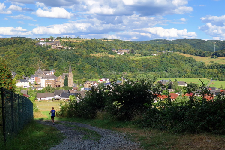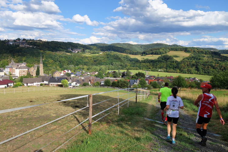 Ich lasse es das Abwärtsstück über 1,7 Km Länge so richtig krachen. Schade nur, dass hier über 100 der vorher hart erkämpften Höhenmeter wieder vernichtet werden. Aber es macht Spaß. Gut, dass ich zu Beginn so verhalten gelaufen bin. Jetzt hab ich den Rhythmus und bin im Lauf.