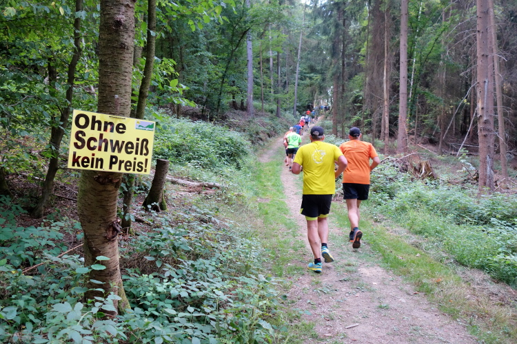 Doch rasch ist Schluss mit lustig und es geht scharf nach rechts den Berg hinauf. Auf dem Boden steht 2,9 Km, also fast die Hälfte ist schon vorbei. Ich quäle mich hinauf. Bei einem längeren Lauf würde ich hier gehen. Aber bei nur 6 Km gebe ich mir keine Blöße und bleibe im Laufschritt. Ist alles Training für den Arelauf am 25. August, sage ich mir und motiviere mich selbst. Wir laufen diese zweite Steigung parallel zum Bach Burghardsseifen. Na ja, man sieht noch etwas Feuchtigkeit im Bachbett. Aber Wasser ist Fehlanzeige. Liegt wohl an der allgemein beklagten Trockenheit.