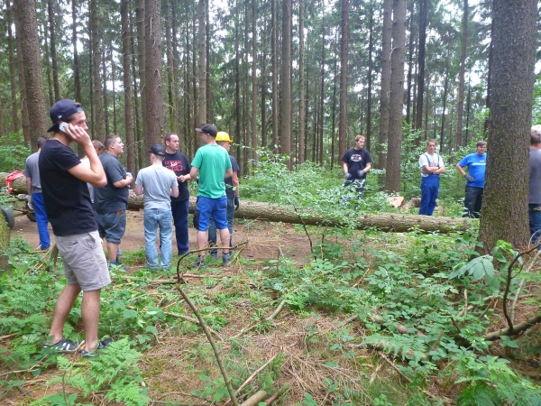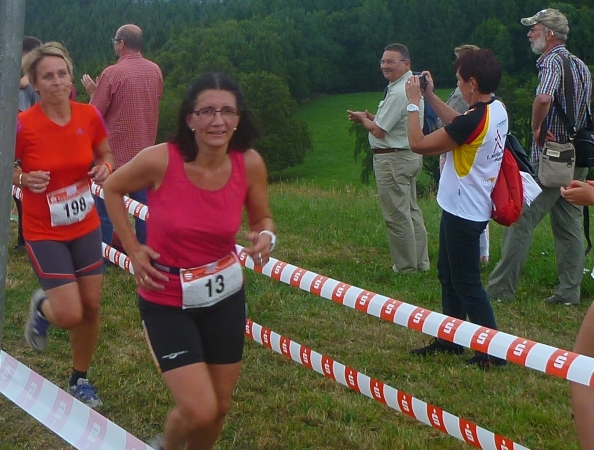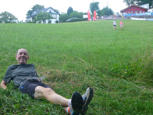 Wir queren die K 3. Von einem Waldstück laufen wir in das nächste. Aber jetzt sind es nur noch wenige Meter durch den Wald, dann geht es nach rechts in ein kurzes flaches Stück, bevor die letzten Meter Steigung zur Skihütte anstehen. Ich lege mich erst mal ins Gras und sammle Kraft für die letzten Meter.